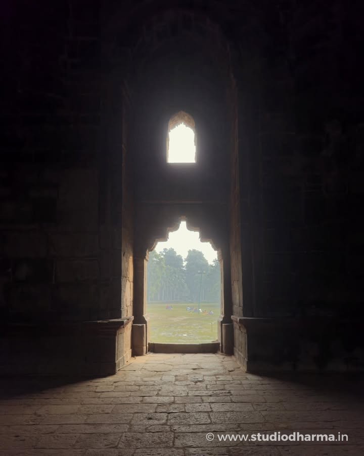 What makes the Bara Gumbad intriguing is not just what it shows, but what it withholds. No grave lies within. No inscription names its patron or purpose. Historians continue to debate whether it was conceived as a monumental gateway to the adjoining mosque, or as a tomb that was never used. Standing on a raised platform, it forms a coherent ensemble with a Jama Masjid and a mehman khana, structures built at different times yet unified in spatial intent.