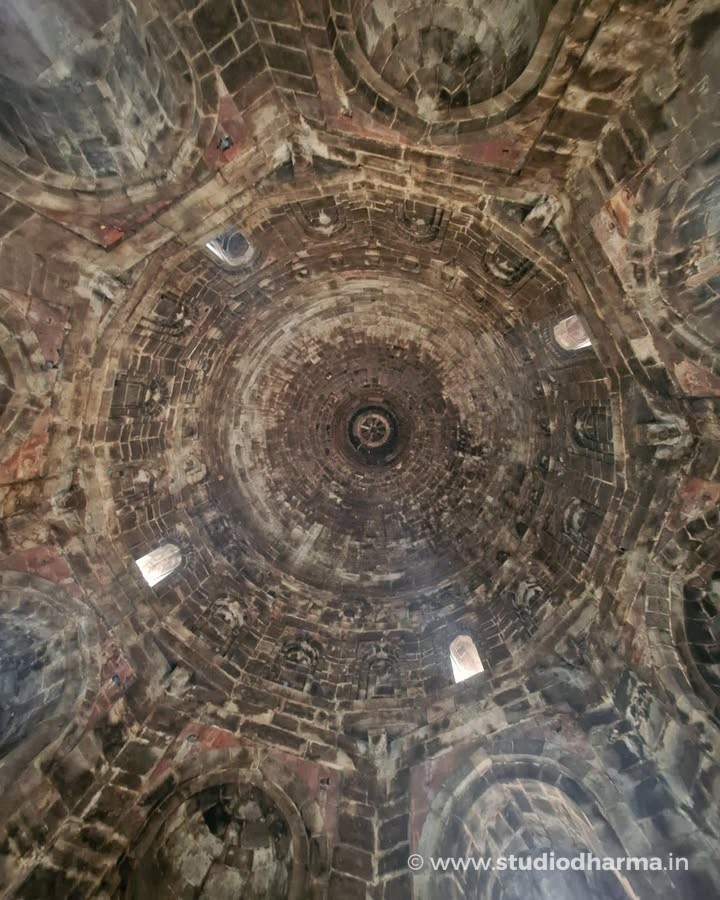 Its façade, crafted in grey quartzite, cleverly creates the illusion of two storeys through blind arches, while inside, traces of plaster ornament hint at a once richly finished interior. Here, Hindu construction techniques and Islamic spatial ideas merge seamlessly, reflecting the cultural synthesis of the late Sultanate era.
