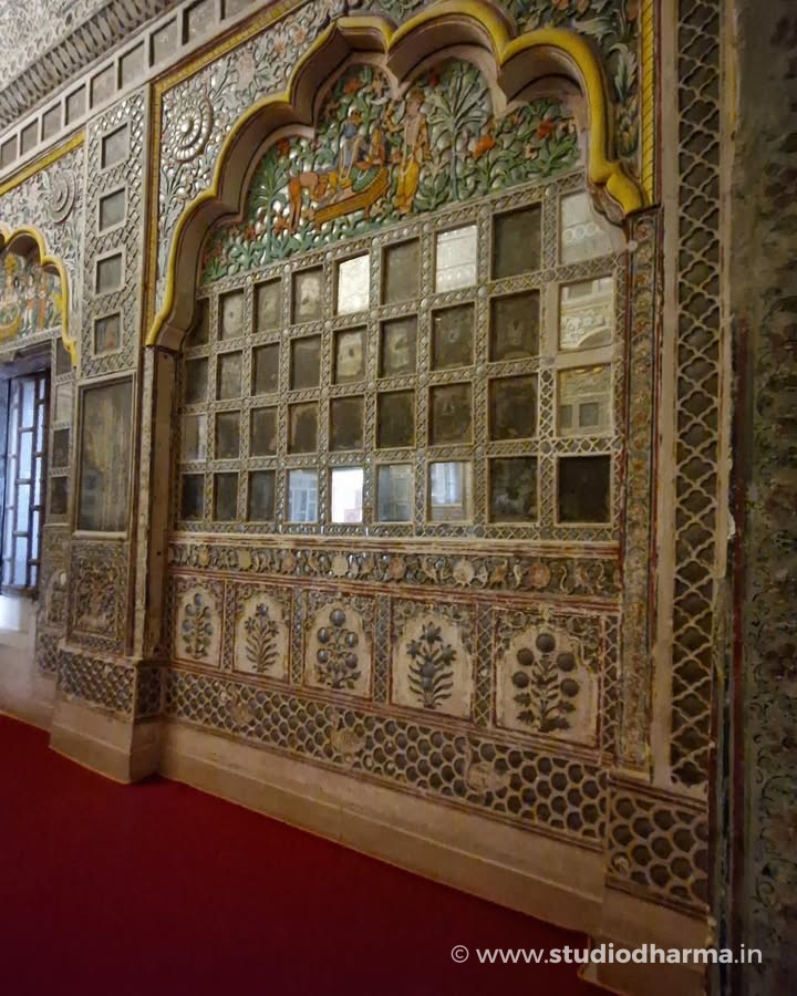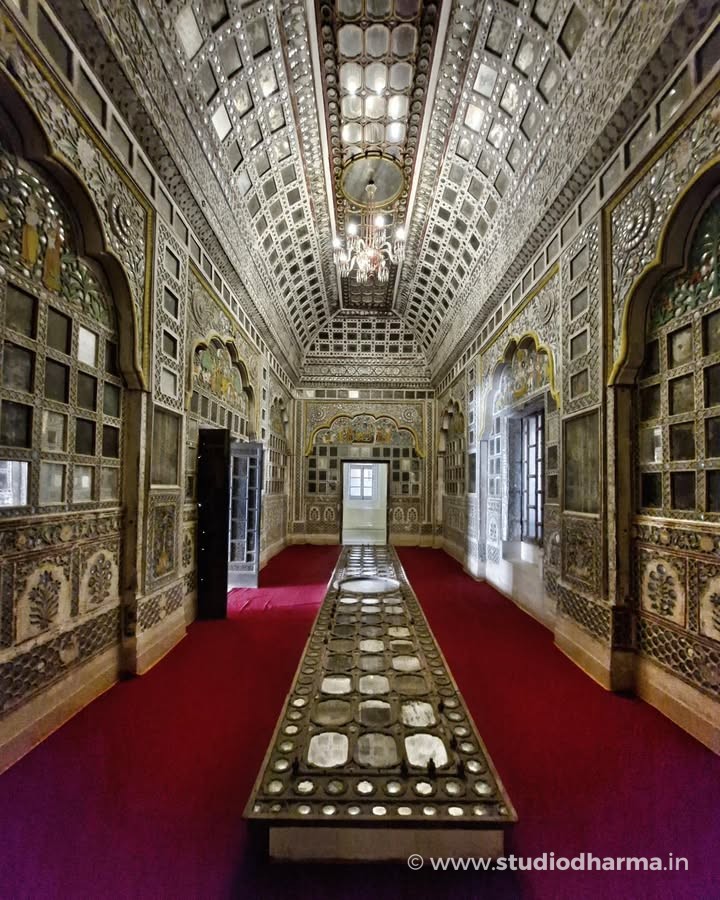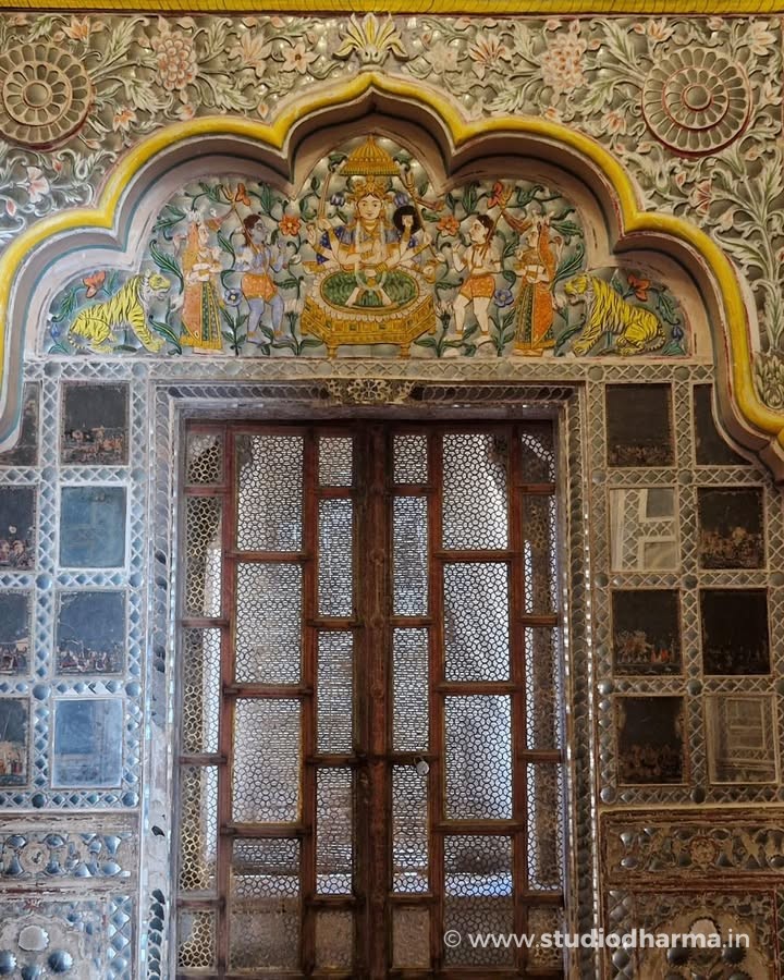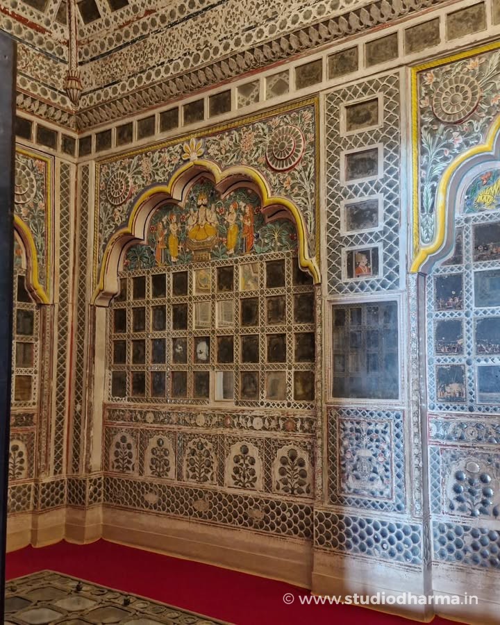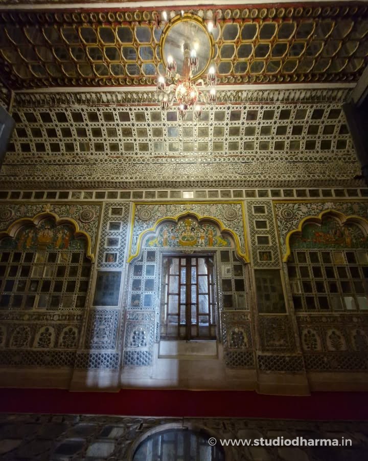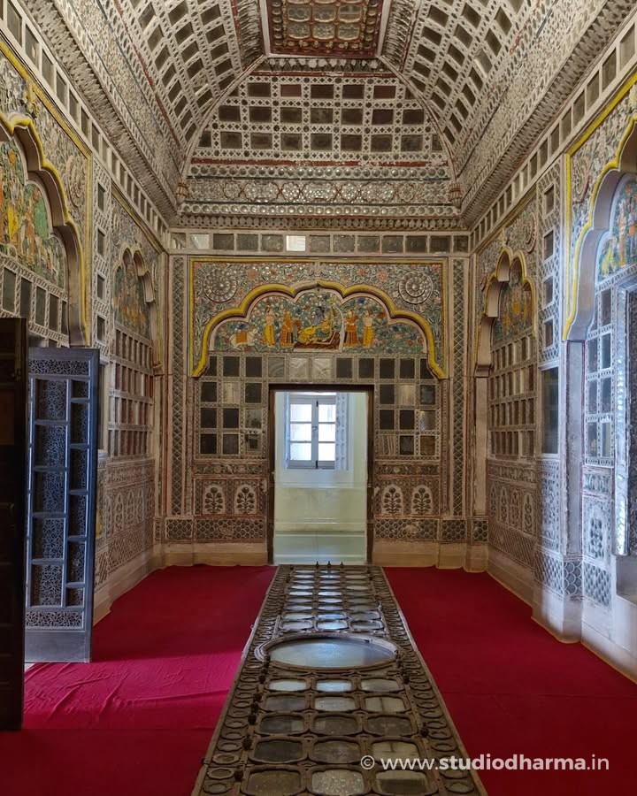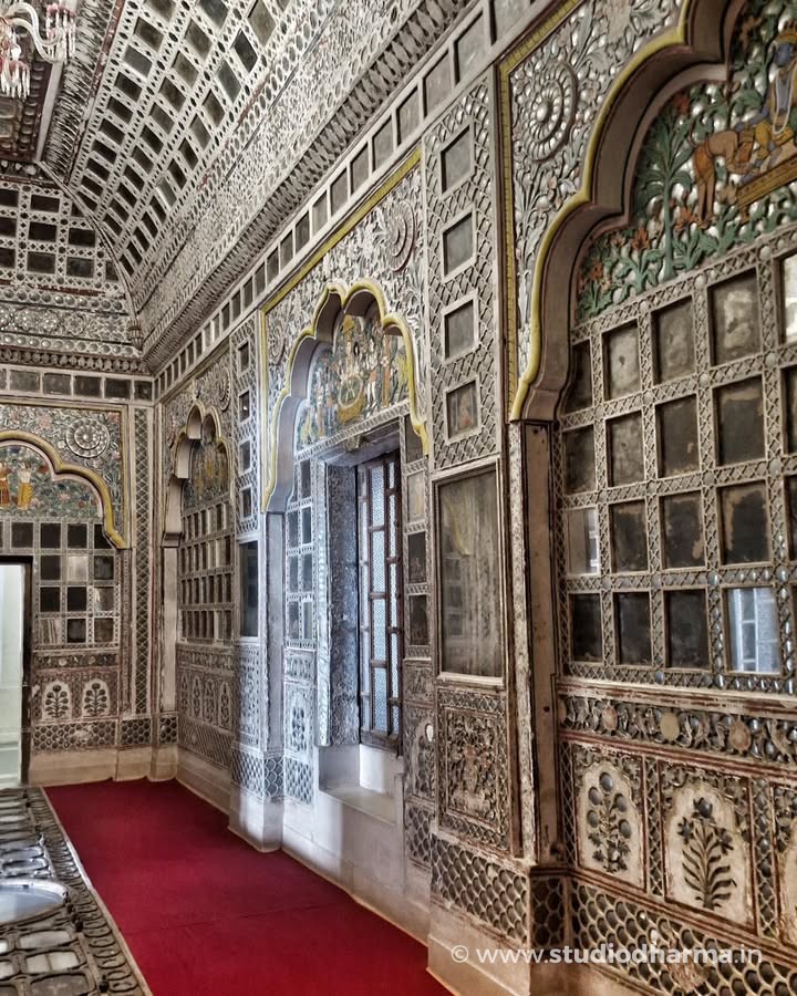 ❖ 𝓢𝓱𝓮𝓮𝓼𝓱 𝓜𝓪𝓱𝓪𝓵, 𝓜𝓮𝓱𝓻𝓪𝓷𝓰𝓪𝓻𝓱 𝓕𝓸𝓻𝓽, 𝓙𝓸𝓭𝓱𝓹𝓾𝓻 ❖. Hidden deep within the massive walls of Mehrangarh Fort lies the Sheesh Mahal, the famed Palace of Mirrors, a space that once reflected royal power, devotion, and refined taste. Part of the private apartments of Maharaja Ajit Singh of Marwar, this chamber took its present artistic form in the early 18th century, following his restoration to full sovereignty after 1707. The walls are adorned with delicate convex mirror inlays set into richly painted panels, designed to shimmer under the glow of a single flame. Religious imagery of Hindu deities painted within arched alcoves reveals the deep cultural and spiritual influences shaping Rajput court life of the period. In the 19th century, the room saw subtle European additions, including a glass chandelier, while the original mirror ceiling is now preserved and displayed on the floor. Standing here, one witnesses not just architectural beauty, but the silent luxury of Marwar’s royal past. This story is part of StudioDharma’s heritage documentation journey. Explore such carefully researched narratives in the premium coffee table book ITIHASNAMA by StudioDharma. Purchase link: ❖ शीश महल, मेहरानगढ़ किला, जोधपुर ❖ मेहरानगढ़ किले की प्राचीरों के भीतर स्थित शीश महल, मारवाड़ के शाही वैभव और कलात्मक संवेदनशीलता का अद्भुत उदाहरण है। यह महल महाराजा अजीत सिंह के निजी आवास का हिस्सा था और इसका वर्तमान अलंकरण 18वीं शताब्दी के प्रारंभ में, 1707 के बाद उनके पूर्ण शासनकाल के दौरान विकसित हुआ। दीवारों पर जड़े उत्तल दर्पण, रंगीन काँच और धार्मिक चित्रांकन, दीपक की रोशनी में पूरे कक्ष को जीवंत कर देते थे। मेहराबों में अंकित देव प्रतिमाएँ उस समय की सांस्कृतिक और धार्मिक चेतना को दर्शाती हैं। 19वीं शताब्दी में इसमें यूरोपीय झूमर जोड़ा गया, जबकि मूल शीशे की छत आज संरक्षित रूप में नीचे प्रदर्शित है। यह लेख StudioDharma की विरासत श्रृंखला का हिस्सा है। ऐसी ही ऐतिहासिक कहानियाँ पढ़ें प्रीमियम कॉफी टेबल बुक ITIHASNAMA by StudioDharma में। खरीद लिंक: