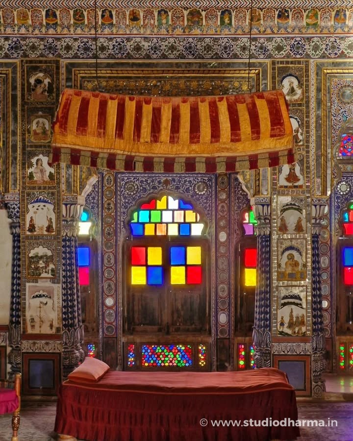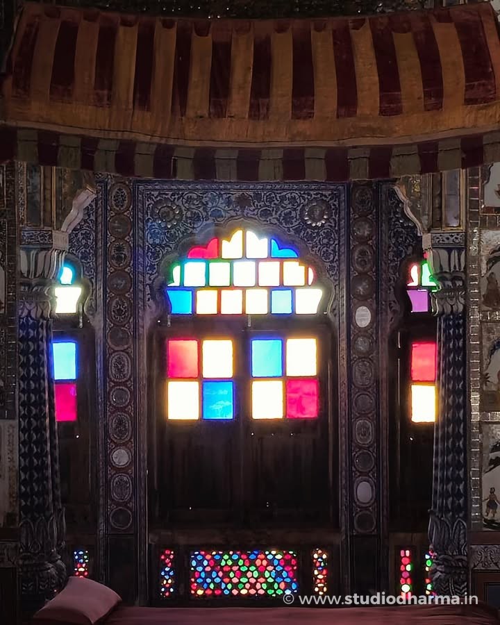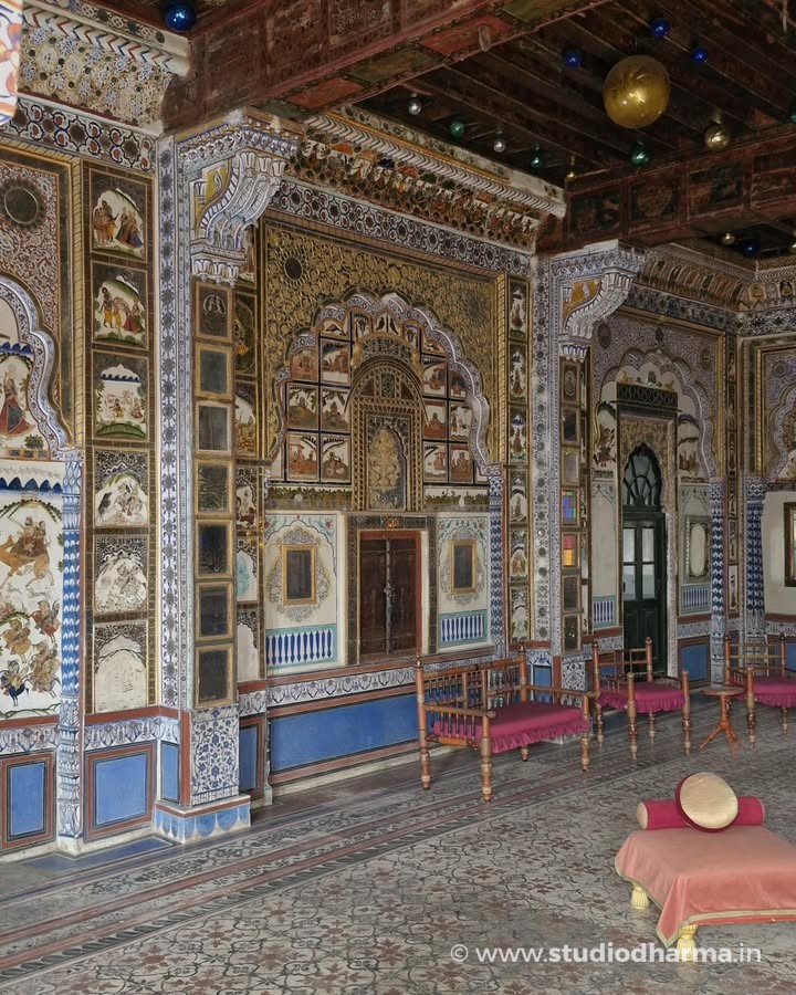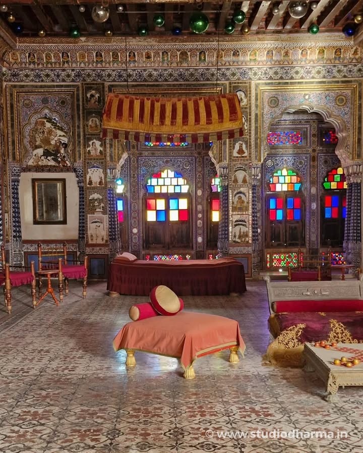 What makes Takhat Vilas extraordinary is its total immersion in art. Walls, wooden ceilings, and even the floor are covered with murals, the floor painted to resemble a rich carpet. The themes move fluidly from Hindu deities and folk narratives to royal hunts and portraits influenced by European aesthetics — a visual record of a kingdom engaging with a changing world. Suspended glass balls, specially ordered for the room, once caught and multiplied light, animating every painted surface.