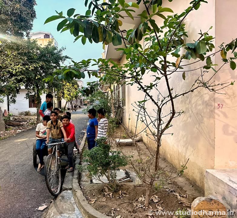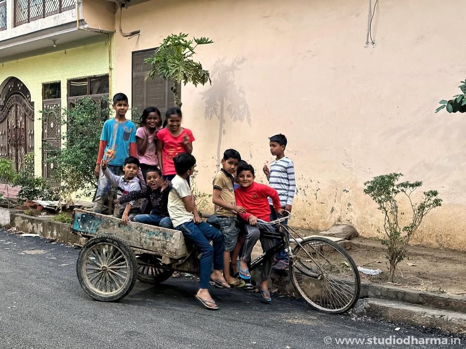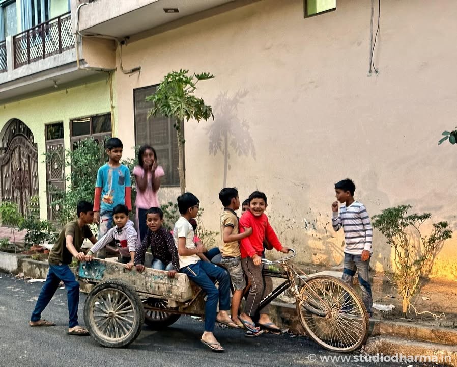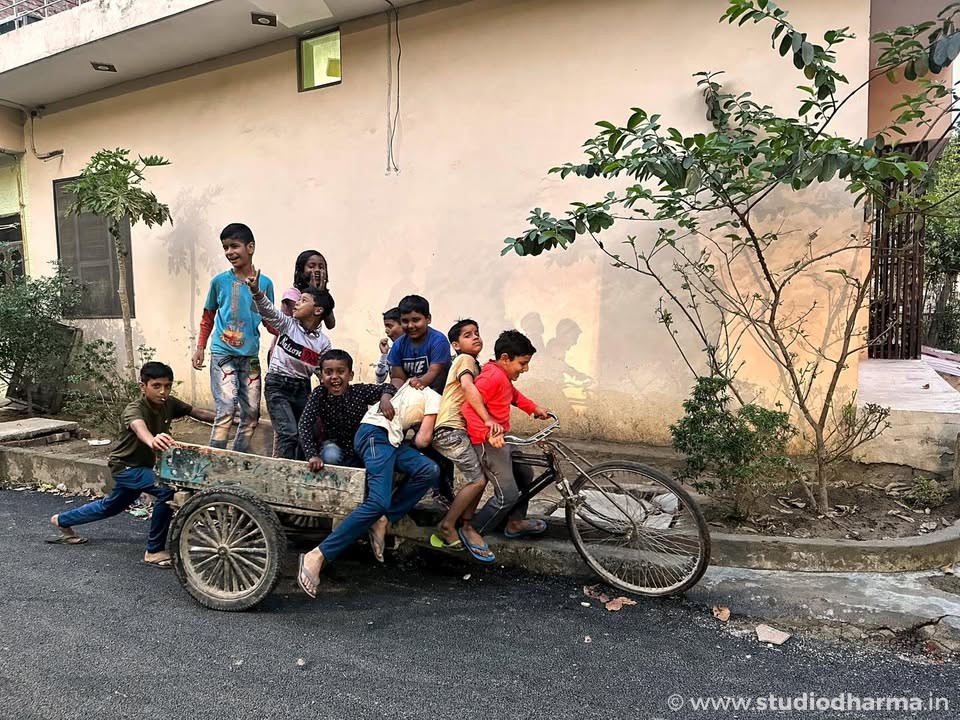A group of kids, a rusty thela, and a street full of laughter — no fancy toys, just pure childhood.
