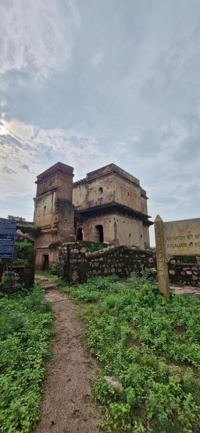 Discover the silent grace of Rasaldar Ki Kothi, a 17th-century double-storied residence with adjoining stables, nestled just north of Shyam Daua’s Kothi in Orchha’s fort complex. This architectural gem features verandahs on raised platforms supported by elegant archways, rectangular rooms with vaulted ceilings, stucco-finished blind arches and floral motifs, and even a basement—offering a rare glimpse into Bundela-era design and military living quarters.