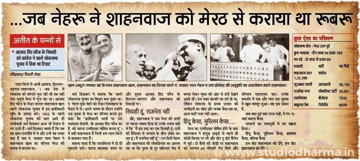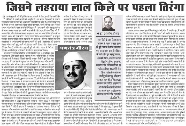 जनरल शाहनवाज खान, आजाद हिंद फौज के पहले मेजर जनरल . लाल किले से ब्रिटिश हुकूमत का झंडा उतारकर तिरंगा लहराने वाले शाहनवाज को क्यों भूल गया ये शहर “स्टूडीओ धर्मा” जनरल शाहनवाज खान के ज़ज़बे,ईमानदारी और देश प्रेम को सलाम पेश करता हैं 1952 में जब देश में लोकतंत्र की कोपलें फूट रहीं थीं तो भारत माता के सिपेहसालार जनरल शाहनवाज खान को मेरठ ने सिर आंखों पर बिठाया। पहले लोकसभा चुनाव में कांग्रेस के टिकट पर जनरल शाहनवाज खान मेरठ के पहले सांसद बने। 1952 से 1971 तक लगातार चार बार सांसद चुने गए। जिस शहर की गली-गली में कभी शाहनवाज का नाम गूंजता था। आजाद हिंद फौज के पहले मेजर जनरल आज मेरठ में ही गुमनाम हैं। रावलपिंडी में जन्मे थे जनरल साहब मेजर जनरल शाहनवाज खान का जन्म 24 जनवरी 1914 को रावलपिंडी, पाकिस्तान के मटौर में हुआ था। पिता झंझुआ राजपूत कैप्टन सरदार टीका खान थे। वह 1940 में ब्रिटिश इंडियन आर्मी में अधिकारी नियुक्त हुए। आजाद हिंदुस्तान में लालकिले पर ब्रिटिश हुकूमत का झंडा उतारकर सबसे पहले तिरंगा लहराने वाले जनरल शाहनवाज ही थे। लालकिले पर हर शाम होने वाले प्रकाश एवं ध्वनि शो में नेताजी के साथ जनरल शाहनवाज की ही आवाज है। 23 साल तक केंद्र सरकार में मंत्री रहे। 1952 में पॉर्लियामेंट्री सेक्रेटी, डिप्टी रेलवे मिनिस्टर बने। 1957-64 तक खाद्य एवं कृषि मंत्री रहे। शाहनवाज खान ने लंबे समय तक विविध मंत्रालय संभाले और देश को तरक्की का तोहफा बख्शा। जब आजादी के समय भारत और पाकिस्तान का बंटवारा हुआ तो वह हिन्दुस्तान से मोहब्बत के चलते यहां आ गए। इसके लिए उन्होंने अपने पूरे परिवार को छोड़ दिया। परिवार क्या बल्कि भरापूरा परिवार-बीवी, तीन बेटे, तीन बेटियां। प्रसिद्ध बॉलीवुड अभिनेता शाहरुख खान की मां लतीफ फातिमा को उन्होंने ही गोद लिया था। शाहरुख के पिता शाहनवाज खान के साथ ही पाकिस्तान से भारत आए थे। बाद में उन्होंने दोनों की शादी भी कराई। 1956 में भारत सरकार ने नेताजी सुभाष चंद्र बोस की मौत के कारणों और परिस्थितियों के खुलासे के लिए एक कमीशन बनाया था, इसके अध्यक्ष भी जनरल शाहनवाज खान ही थे। कोई याद ही नहीं करता रक्षापुरम से आगे एडब्ल्यूएचओ कॉलोनी में जनरल शाहनवाज खान की बहू, पोते और पूरा परिवार रहता है। जनरल खान के बड़े पोते आदिल खान कहते हैं, हमने कई बार सरकार और प्रशासन से कहा कि शहर में जनरल साहब की याद में कोई स्मारक बने, लेकिन सुनवाई नहीं हुई। थक हारकर हमने ही 2010 में जनरल शाहनवाज मेमोरियल फाउंडेशन बनाया। हर साल उनकी बरसी पर जामा मस्जिद के पास मजार पर आयोजन करते हैं। यह दुर्भाग्य और अपमान है उस सपूत का, जिसने आजादी की लड़ाई में अपने कदम नहीं डिगने दिए। नेहरू जी ने स्वयं जनरल साहब को मेरठ से चुनाव लड़ने भेजा था, लेकिन आज 