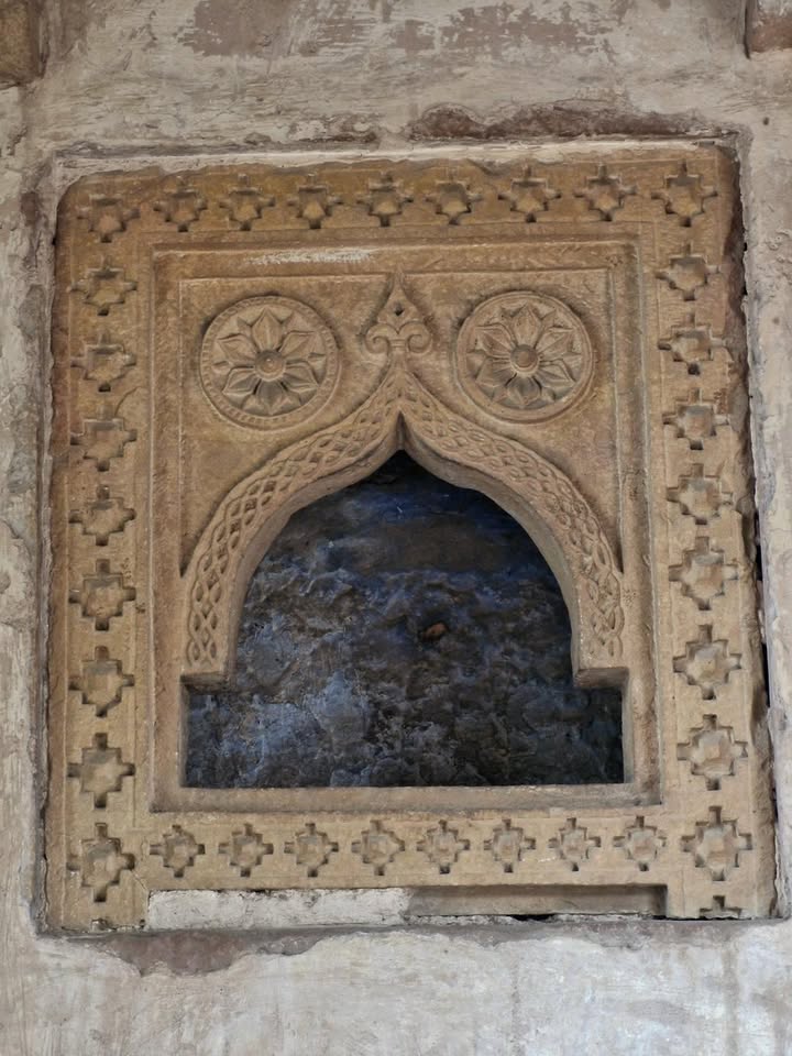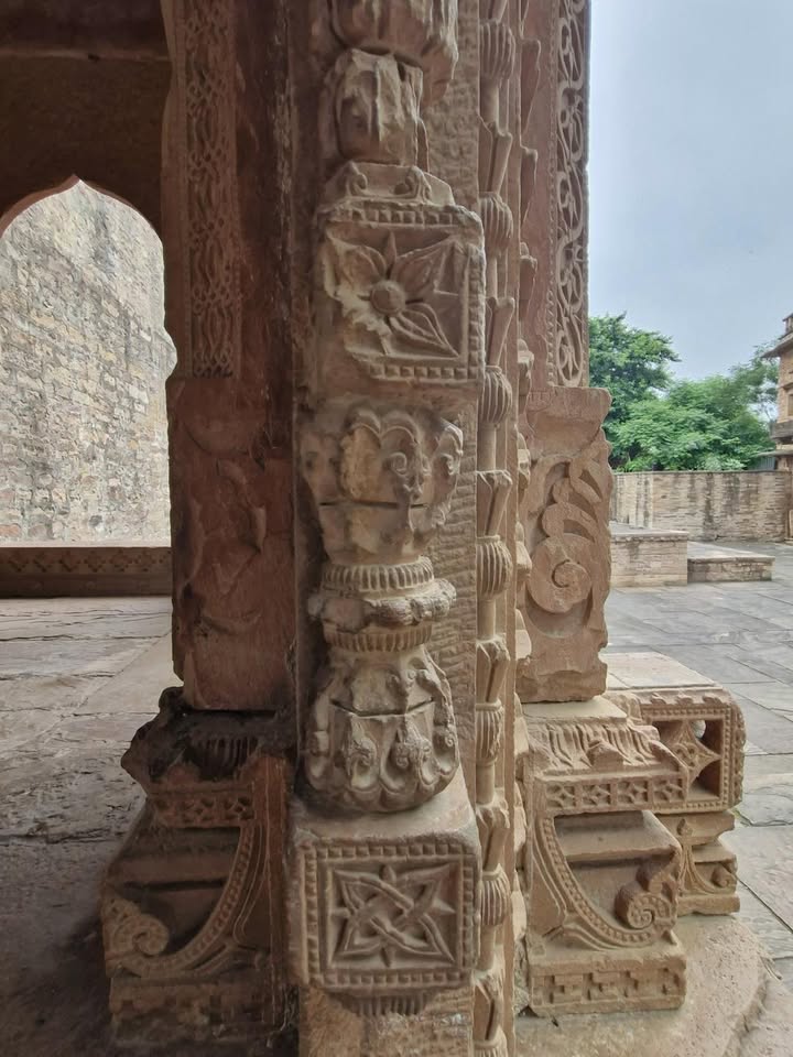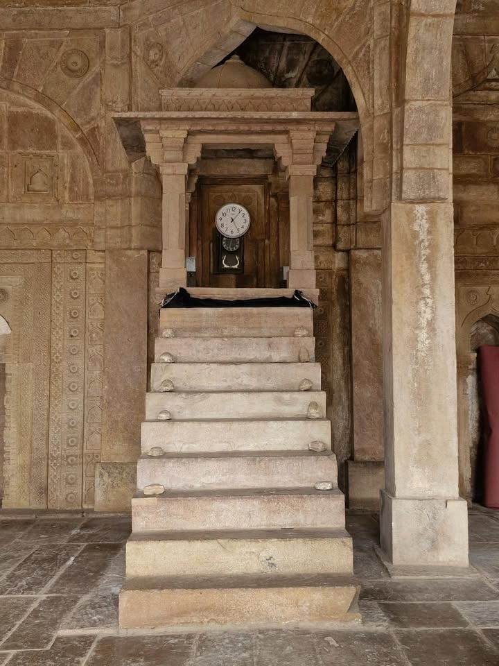 The arches are framed with intricate floral and geometric carvings. The prayer hall opens with eleven arches toward the courtyard, while the cloisters on the north and south have nine arches each. Inside, there are several mihrabs on the qibla wall and a central mimbar (pulpit) of stone with eight steps used for Friday sermons. Another architectural wonder is the use of serpentine brackets that support the eaves — elegant and ornamental.