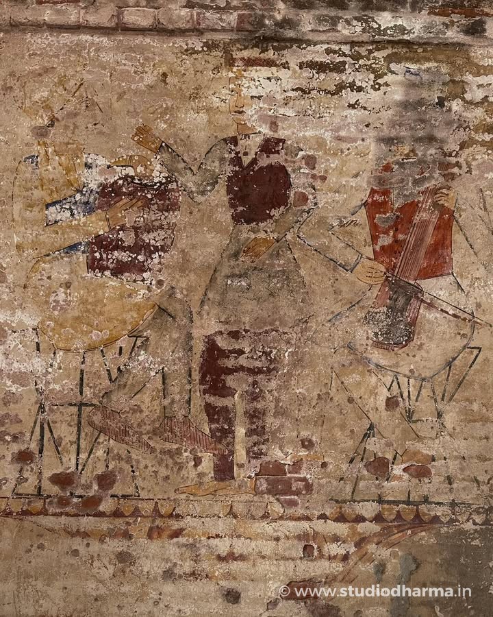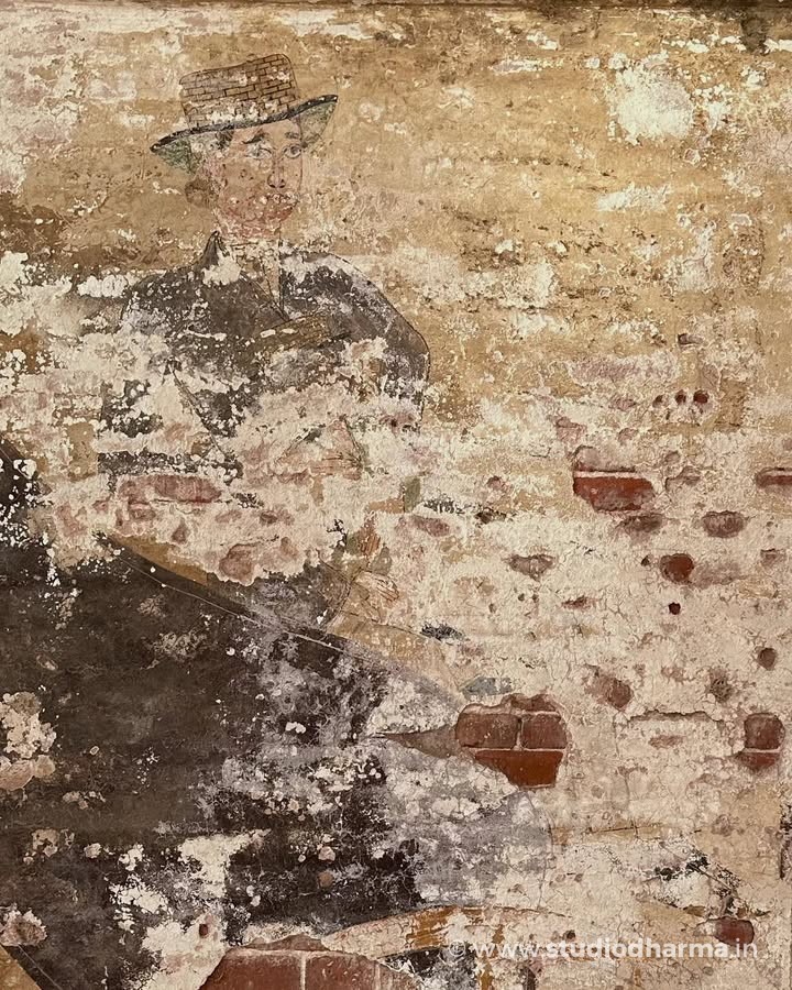 One wall still preserves the figure of a European gentleman dressed in colonial attire, reflecting how British imagery entered local artistic traditions during the colonial period. Nearby, another mural shows musicians playing traditional instruments, perhaps representing gatherings and celebrations that once filled this haveli with music. In another corner survives a delicate side-profile portrait of a woman painted in a style reminiscent of North Indian miniature traditions.