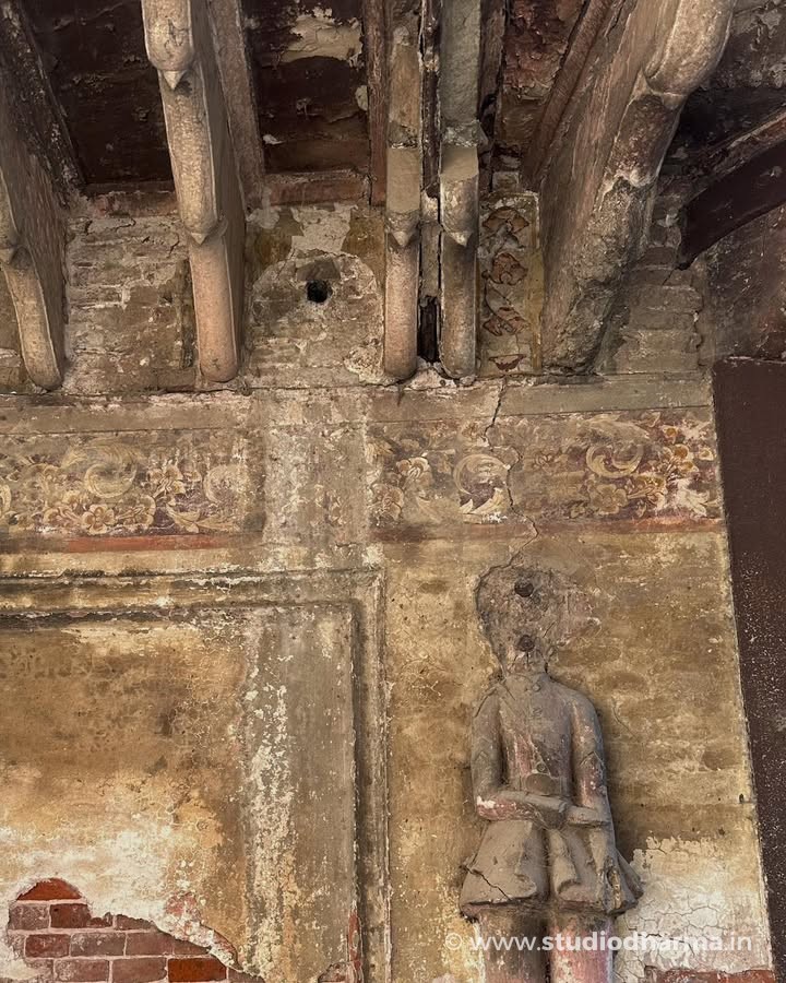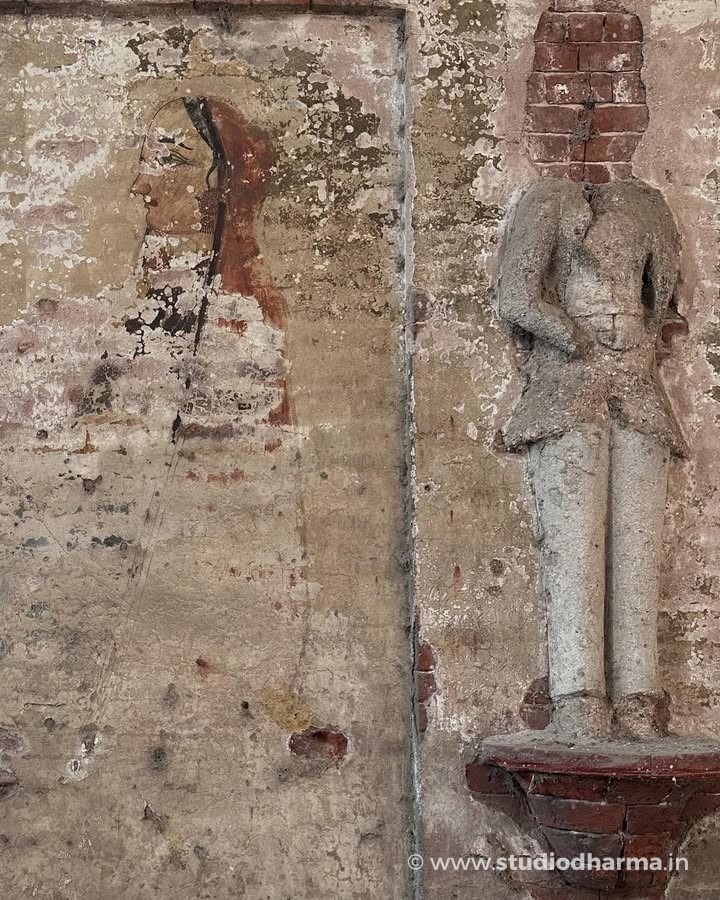 Hidden beneath layers of peeling plaster survive fragments of remarkable lime-plaster wall murals. Though severely damaged by time and neglect, these paintings still reveal glimpses of another era.
