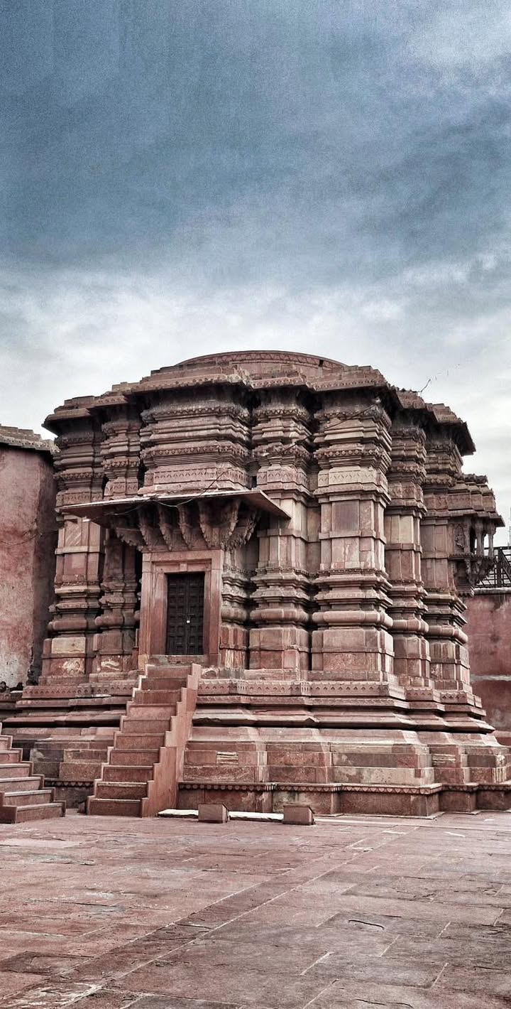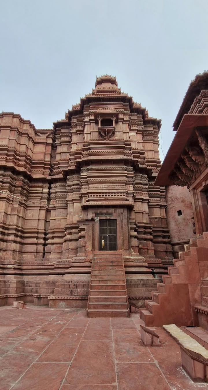 The Govind Dev Ji Temple in Vrindavan, near Mathura, was built around 1590 AD by Raja Man Singh I, a commander under Mughal Emperor Akbar. Akbar donated the distinctive red sandstone used in its construction, and the temple originally rose to seven stories, featuring a marble, silver, and gold altar, and an elaborately sculpted lotus ceiling .
