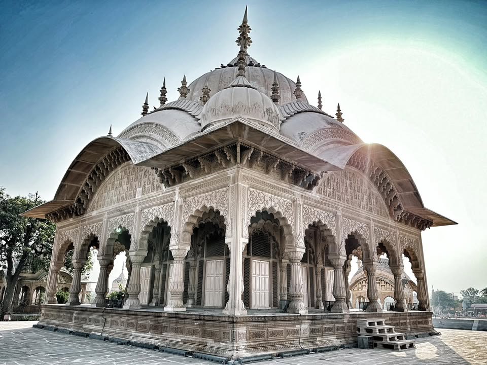 Historically, Kusum Sarovar began as a natural pond, known as Suman Sarovar during the era of Lord Chaitanya. Around 1675, Veer Singh of Orchha reshaped it into a structured reservoir. In the 18th century, the mighty Jat ruler Raja Suraj Mal developed the surrounding gardens. Later, his son Jawahar Singh built the magnificent sandstone cenotaphs in 1764, enshrining the memory of the Bharatpur royal family.