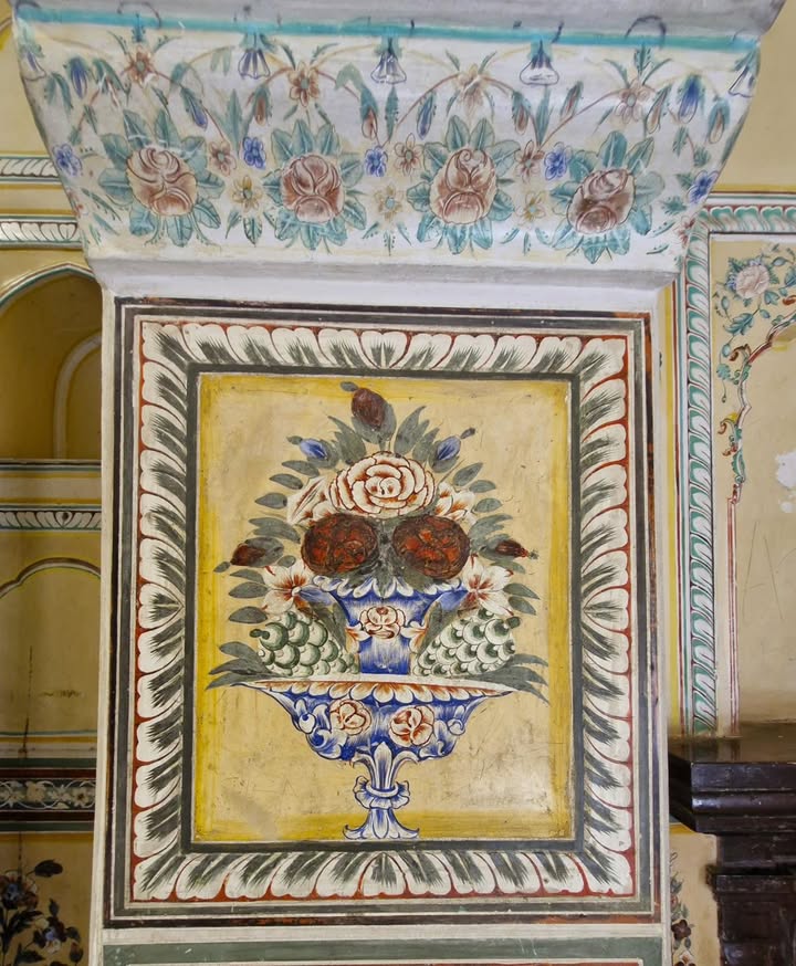 The palace is a marvel of royal planning — nine identical suites for the queens, each connected through airy corridors to the king’s central suite. These corridors open to a vast terrace offering sweeping views of Jaipur below. Inside, delicate frescoes, intricate arish mirror work, and pastel floral walls reflect the soft luxury of an era gone by.
