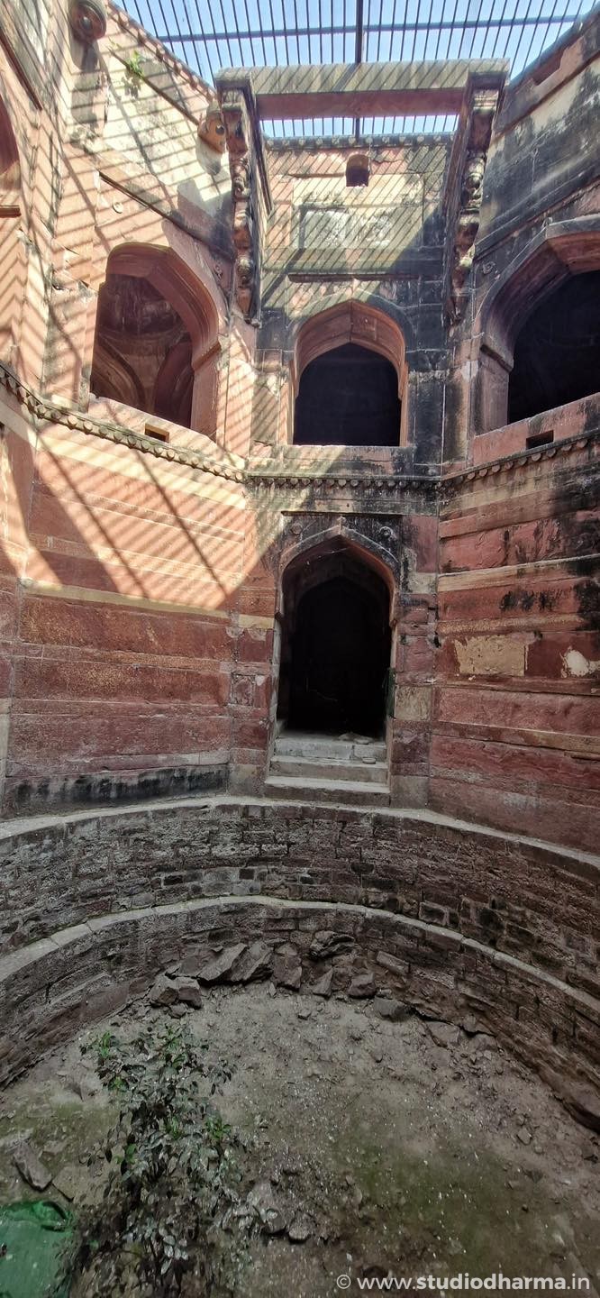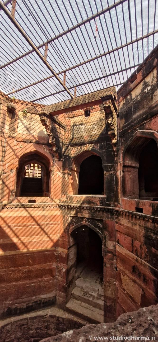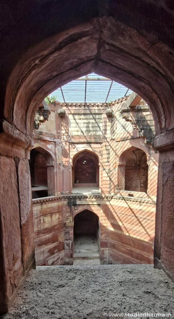 लाल बलुआ पत्थर से बनी इस बावड़ी में उत्तर और पश्चिम दिशा से तेरह खड़ी सीढ़ियाँ एक सपाट छत तक जाती हैं, जहाँ एक अष्टकोणीय मंच स्थित है। यह मंच उन कमरों की छत को चिह्नित करता है जहाँ विशाल पवनचक्कियाँ पानी ऊपर उठाने के लिए घूमती थीं।