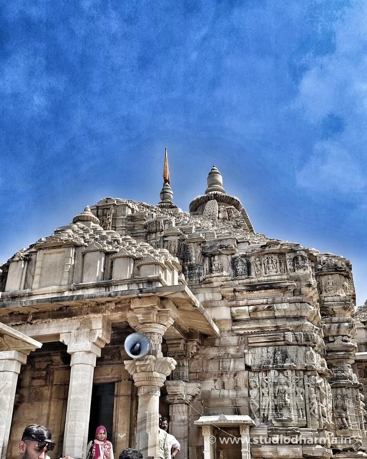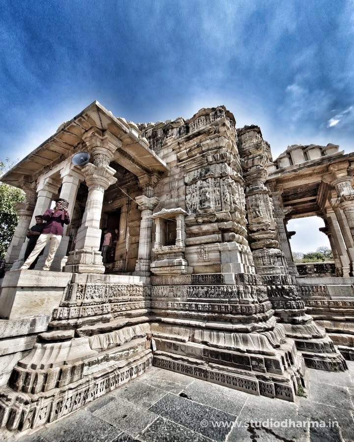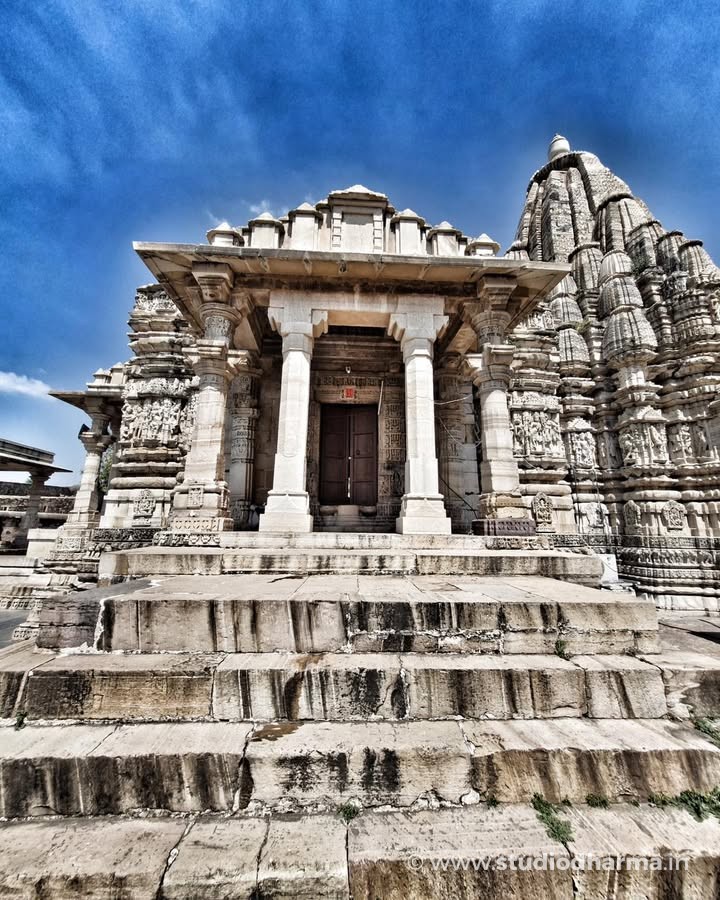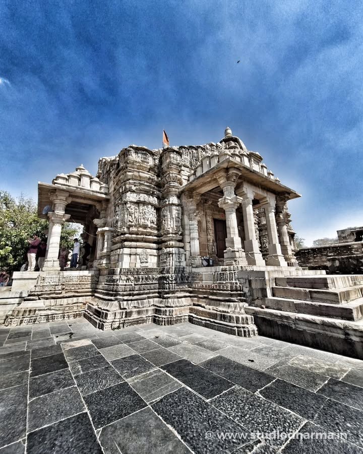 Crafted in the Nagara style of temple architecture, the shrine rises in quiet symmetry—its light-colored stone softly glowing under the Rajasthan sun. Every carved surface, every sculpted form, feels less like decoration and more like devotion turned into stone.