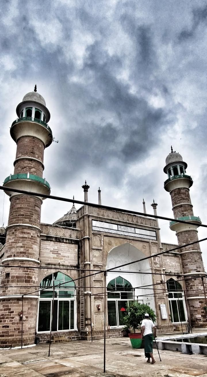 Built on a raised stone platform, the mosque features an east-facing entrance reached via a flight of stone steps. Its façade is flanked by two circular minarets, each segmented into six levels with projecting chajjas and topped by domes. A domed canopy arches above the gate, supported by stone columns, beneath which lies a Persian inscription on a marble plaque.