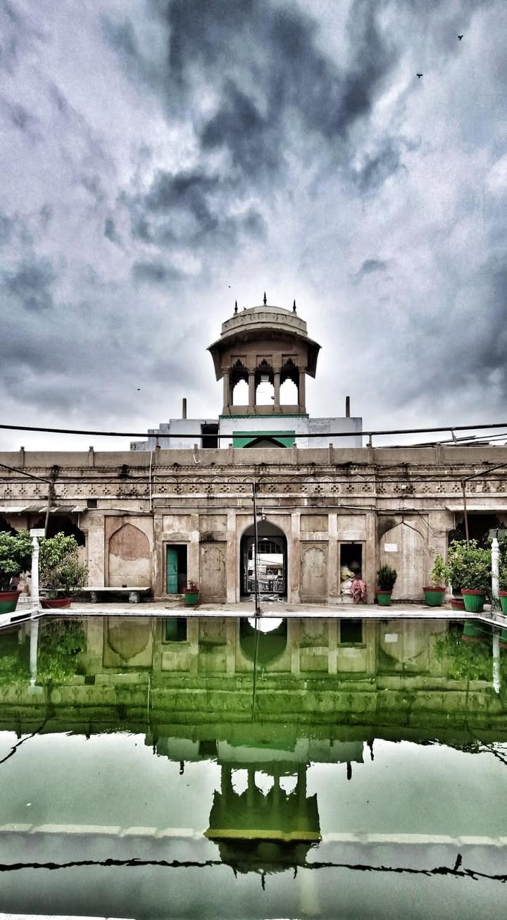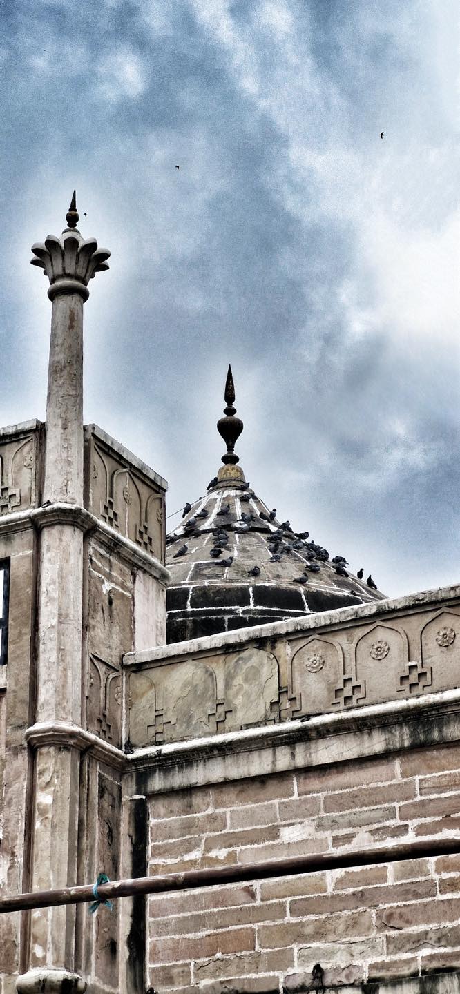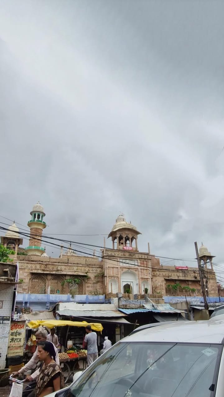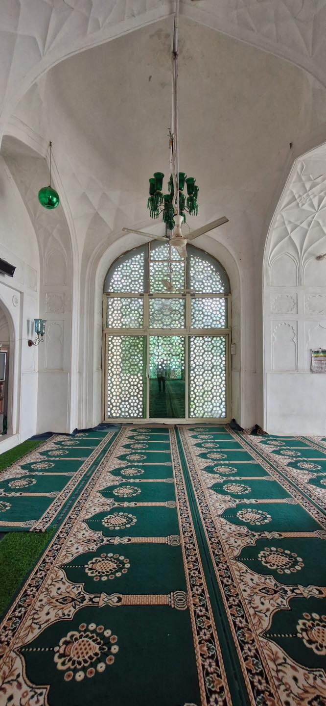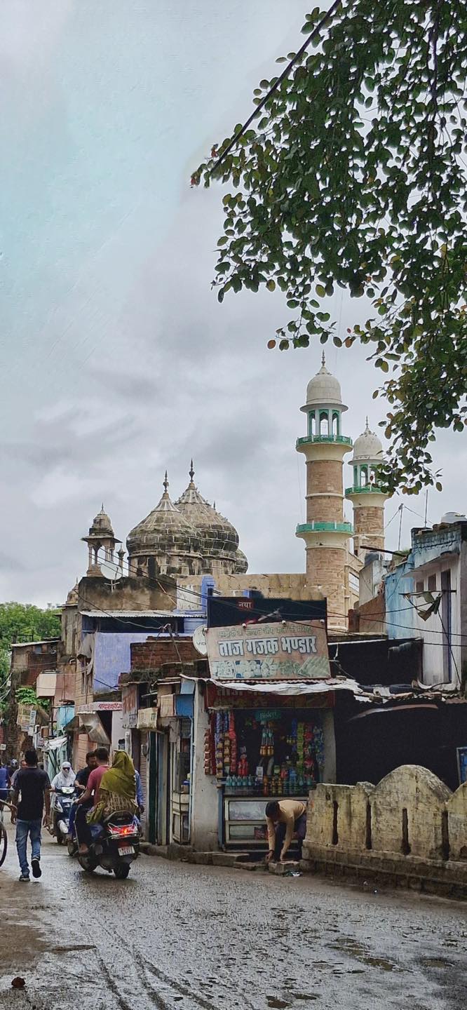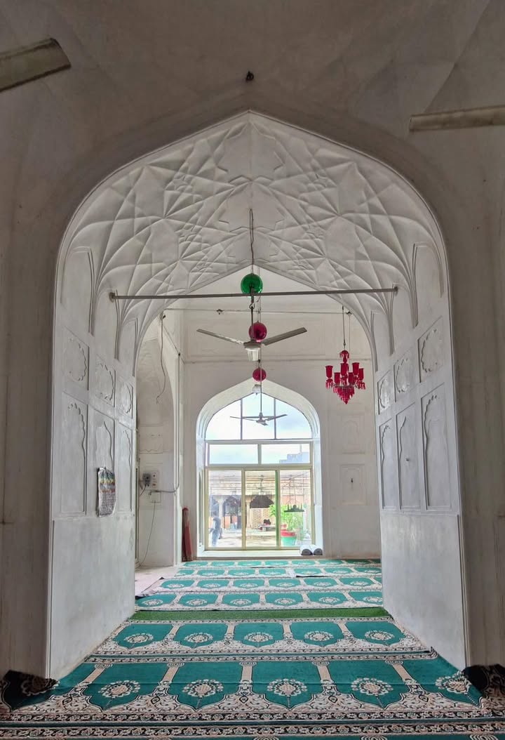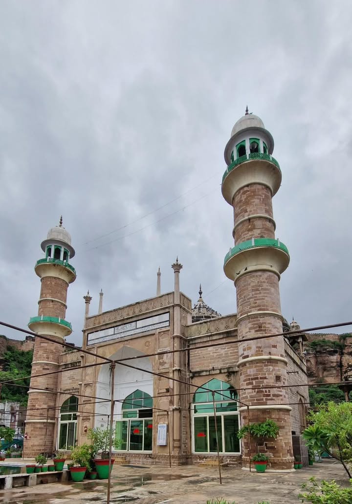 The main prayer hall has three arched doorways, the central one accentuated by four slender minarets, intricate floral reliefs, and Islamic calligraphy. Above it rise three domes, while the central courtyard contains a water tank for ablutions. The mosque’s light brown sandstone cladding and refined detailing make it a historic and architectural gem of Gwalior.