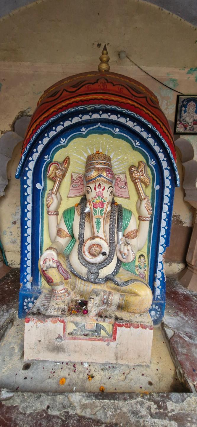 The temple’s architecture is simple yet striking, with its arched dome-like roof and intricately decorated interiors. At its sanctum rests a unique marble idol of Lord Ganesh. What makes this idol extraordinary is its trunk bending to the right (Dakshinabhimukhi form). Such idols are rare and considered highly powerful, associated with energy, strength, and strict rituals of worship. Unlike left-bending trunks, which symbolize calmness and are common in households, right-bending Ganesh idols are believed to embody fiery energy and are usually housed in temples like this.