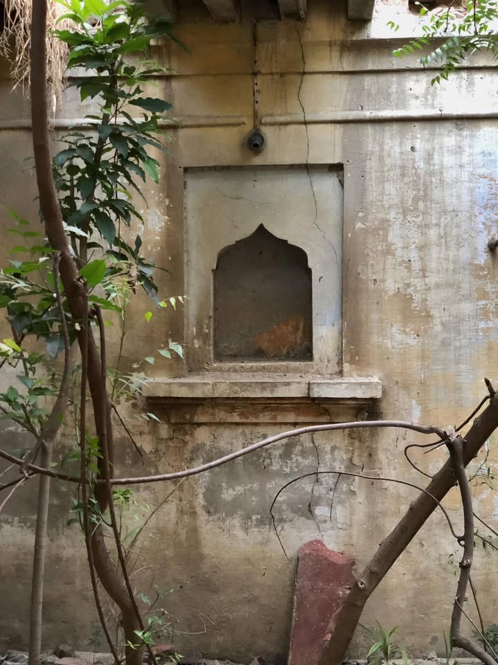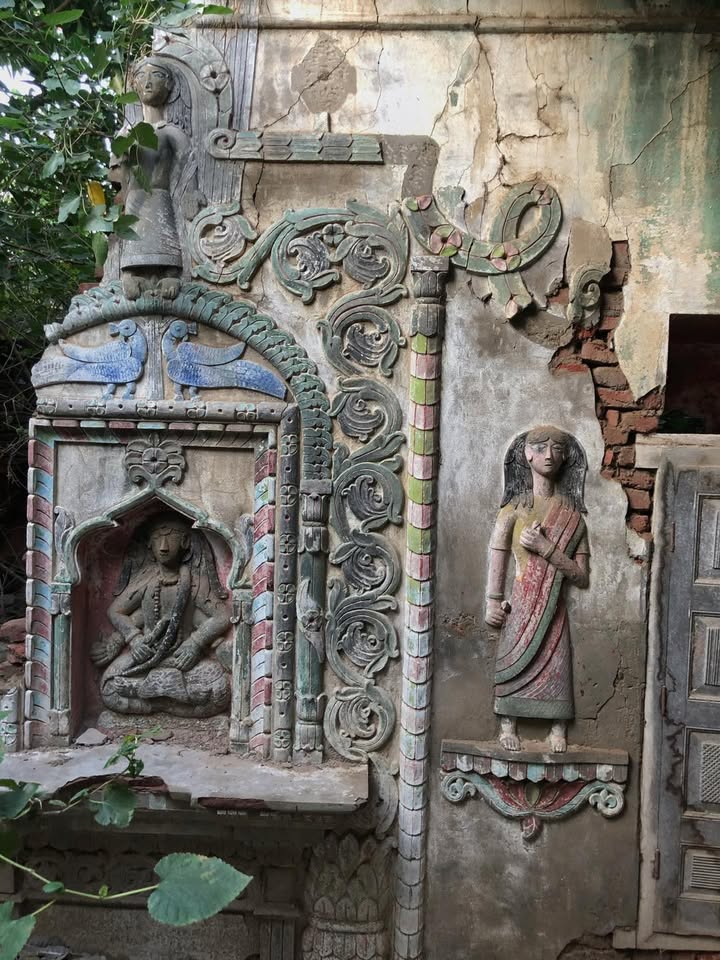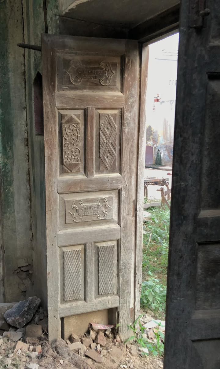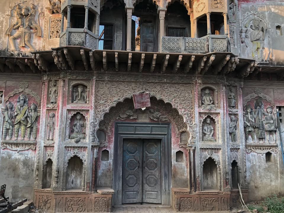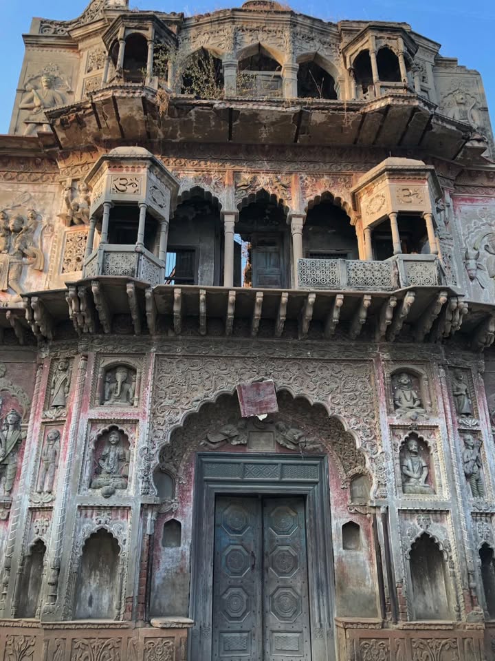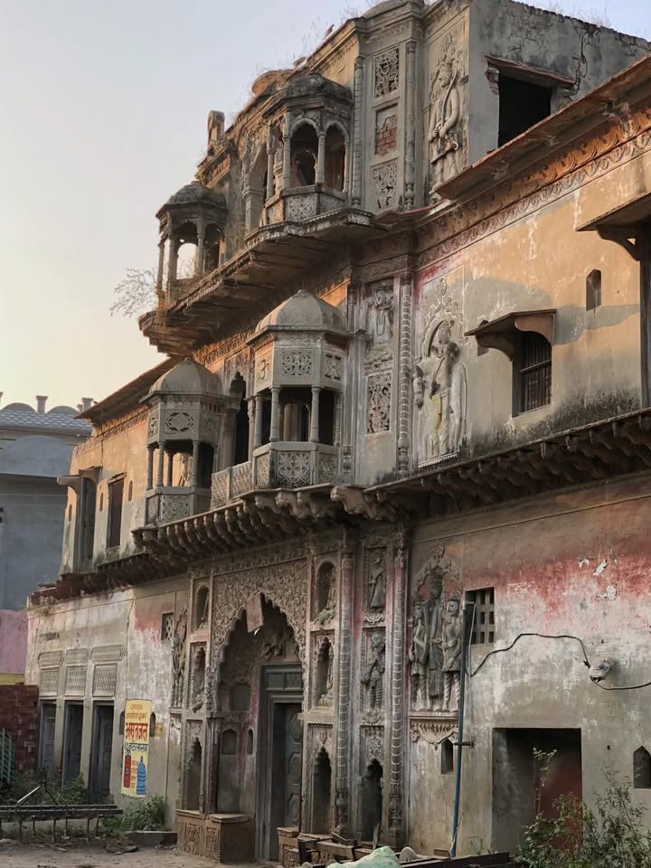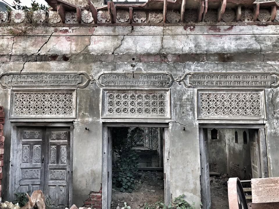 Each balcony (jharokha), each mural tells of an era when faith and art were interwoven — when even the plastered walls bore the marks of reverence. The faded reds and greens, the deity reliefs on the façade, and the old wooden doors carved with Om and floral motifs evoke a forgotten craftsmanship now rarely seen in western Uttar Pradesh.