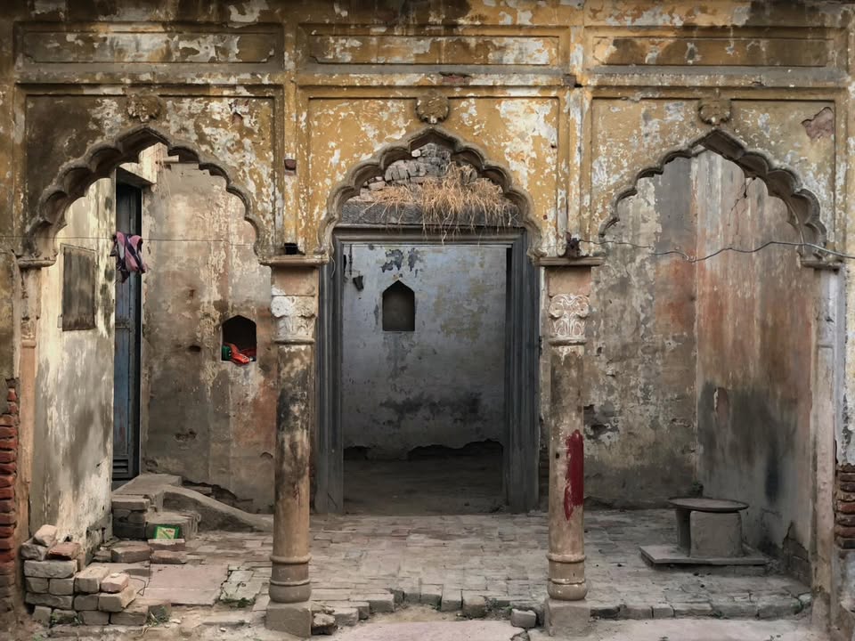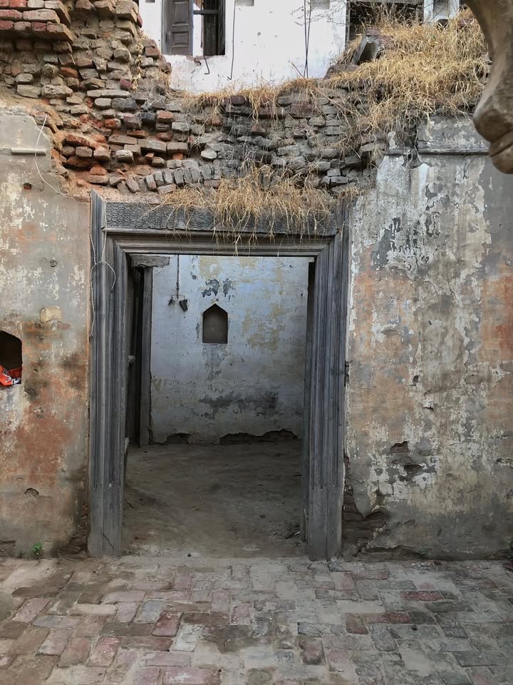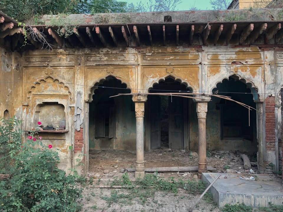 Built over a century ago by Pandit Shriram Sharma Ji, the landlord of six villages — Ghasauli, Sindhawali, Murlipur, Dabka, Satwai and Dayampur — this haveli was much more than a home. It was a statement of devotion. The gateway itself, adorned with intricate stucco carvings of deities, peacocks, and celestial figures, still reflects the spiritual heart of the family that once lived within.