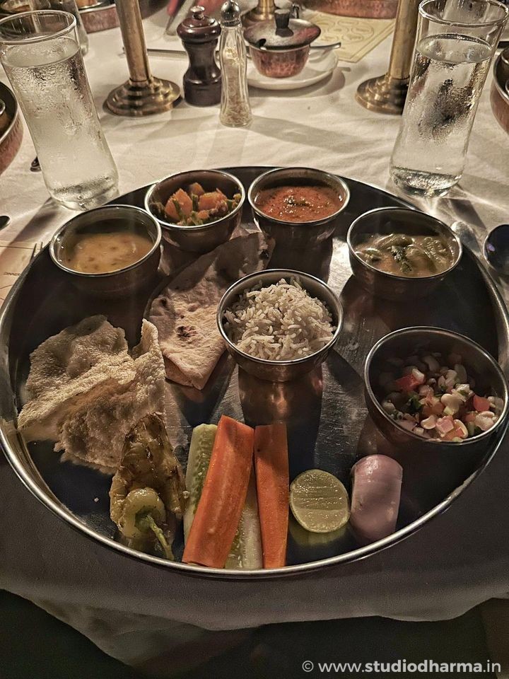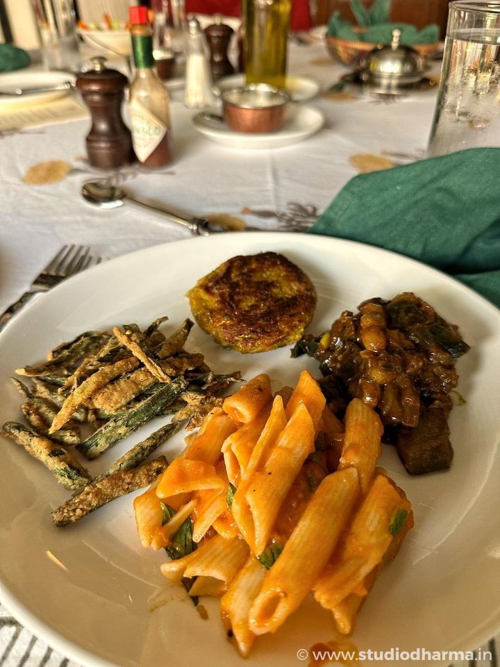 Lunch features light, continental fare with home-baked bread, pies, and fresh salads from the organic garden, while dinner showcases a traditional Indian thali.