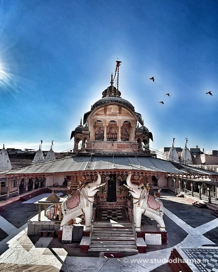 मंदिर का प्रवेश द्वार पहली दृष्टि में साधारण प्रतीत होता है, पर जैसे ही श्रद्धालु भीतर प्रवेश करता है, उसकी भव्यता धीरे-धीरे खुलती चली जाती है। द्वार पर खड़े दो विशाल श्वेत हाथी मानो इस पवित्र स्थान के रक्षक हों, जो हर आगंतुक का मौन स्वागत करते हैं।