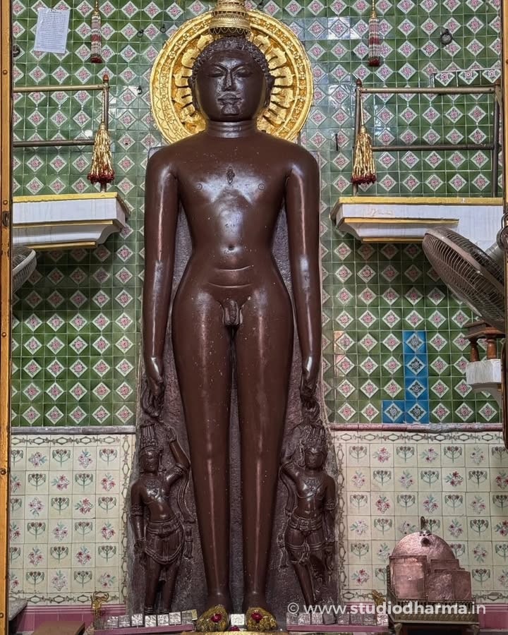 Inside the sanctum rises the magnificent idol of Lord Shantinath, the 16th Tirthankar of Jainism. The statue stands nearly twelve feet tall. Its smooth polished surface carries a deep bronze-like glow, yet it is not metal at all — it is stone, finished so carefully that it reflects light like metal. The effect is mesmerizing.