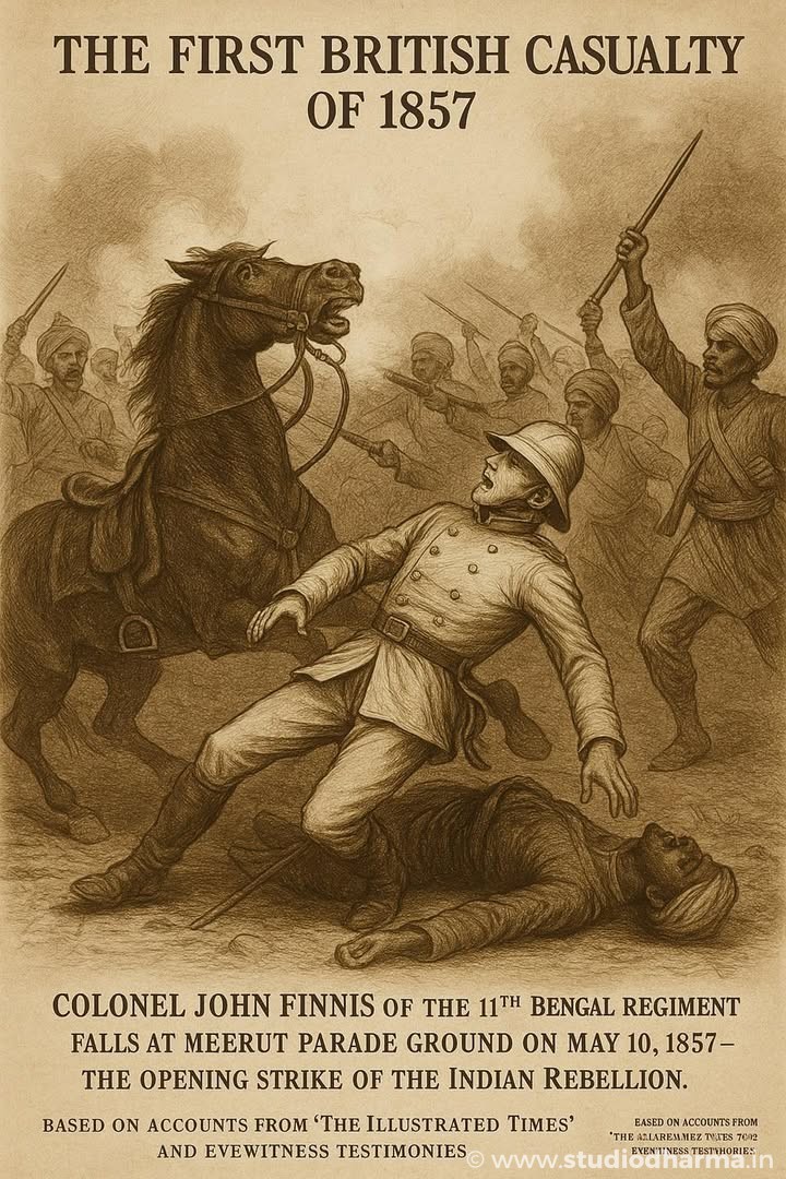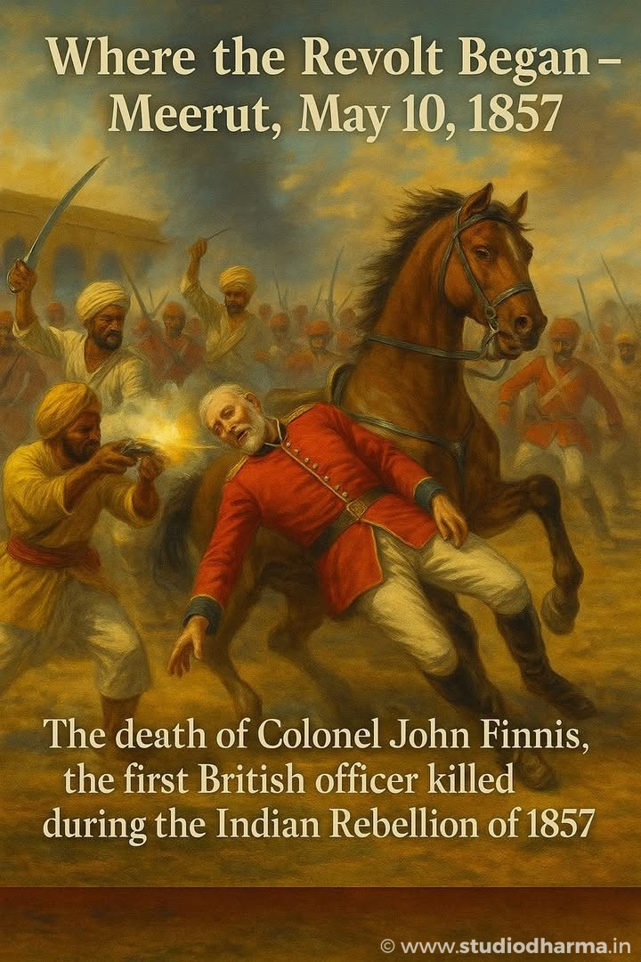 On May 10, 1857, the parade ground of Meerut became the flashpoint of a revolution. Colonel John Finnis of the 11th Regiment, Bengal Army, attempted to suppress the uprising among the sepoys of the 20th Regiment. He was shot dead from his horse—the first British officer to be killed in what would ignite the Indian Rebellion of 1857.