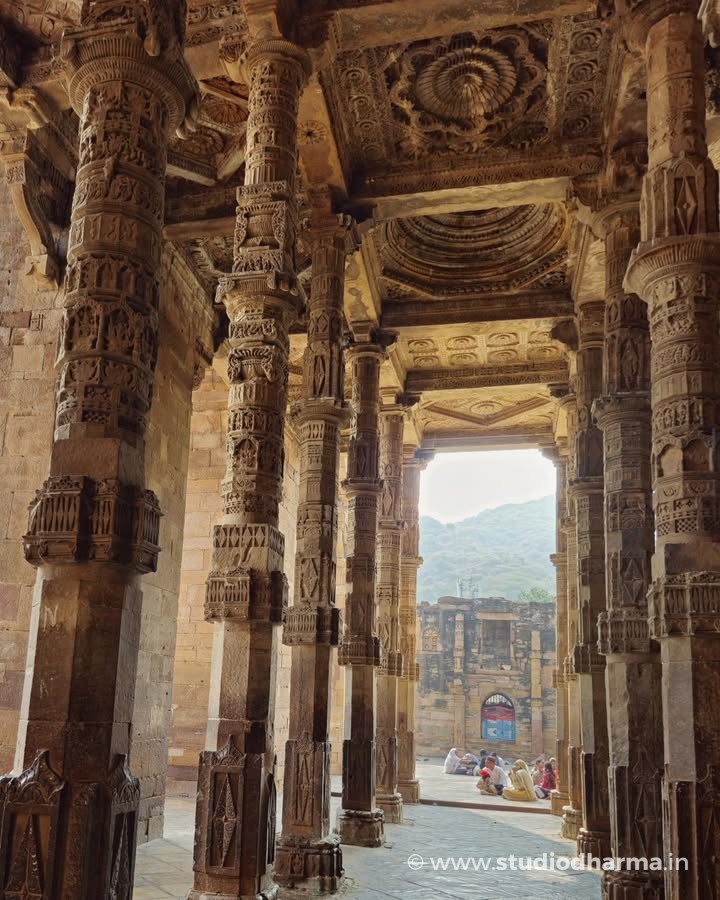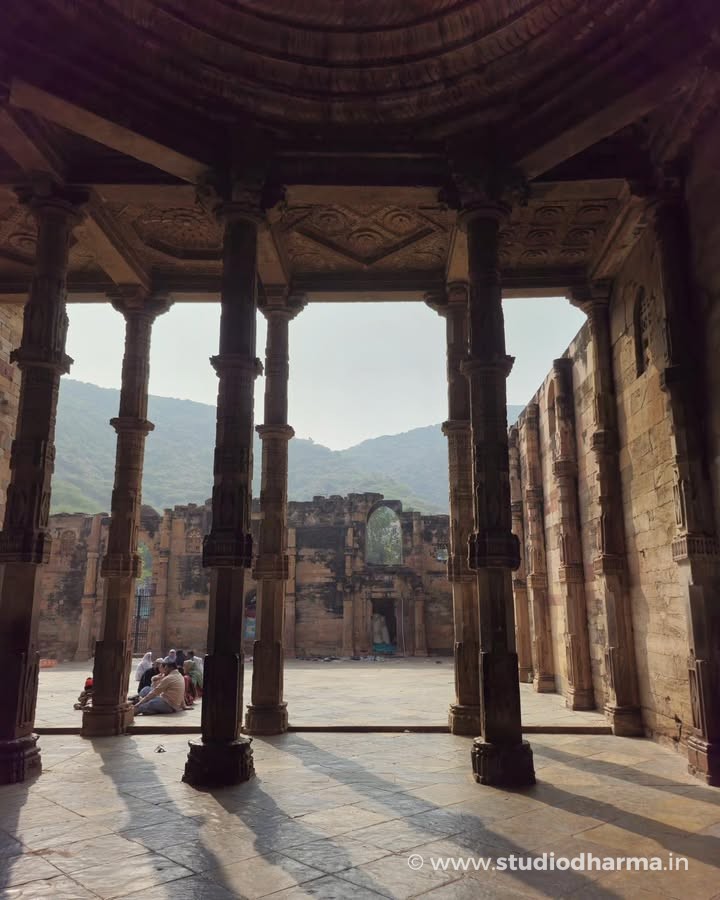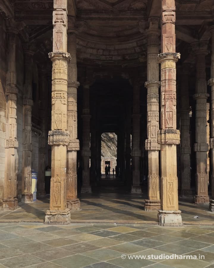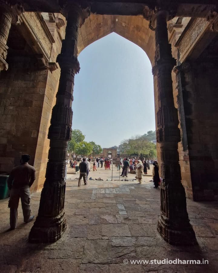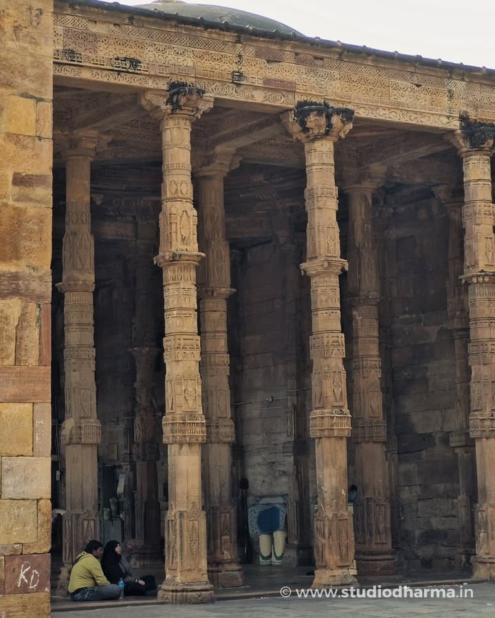 Even today the interior of the monument reveals traces of that earlier world. The prayer hall stands on hundreds of intricately carved pillars displaying motifs typical of Hindu and Jain temple architecture. Archaeologist Alexander Cunningham suggested that many of these pillars may have come from dozens of earlier temples in the region, making the structure one of the earliest examples of architectural reuse in Indo-Islamic monuments.