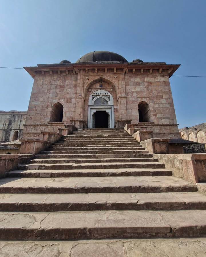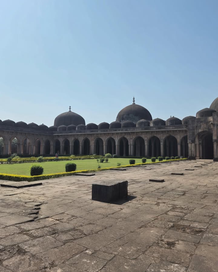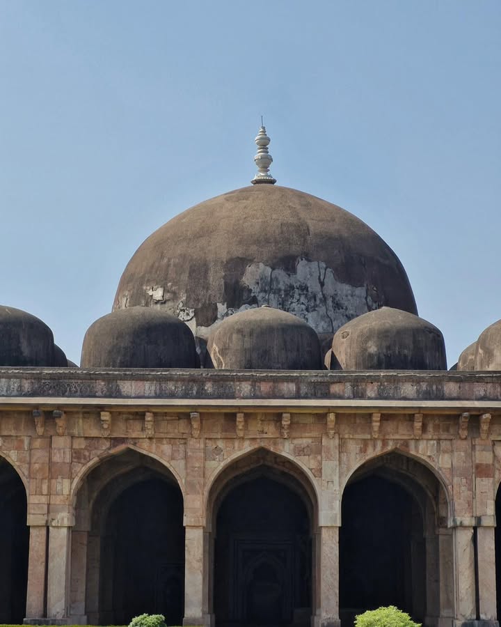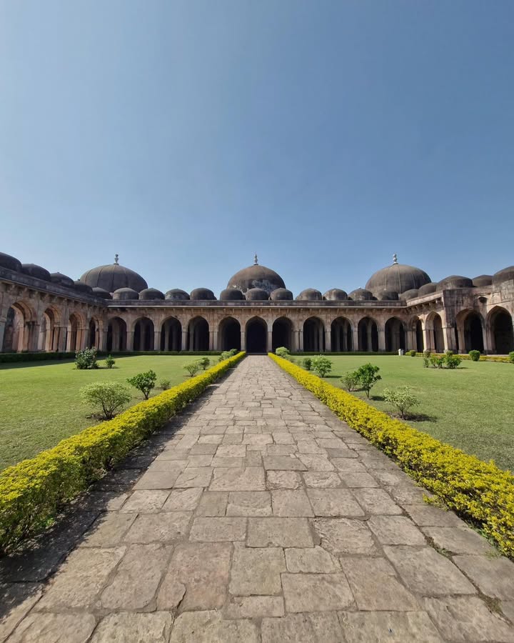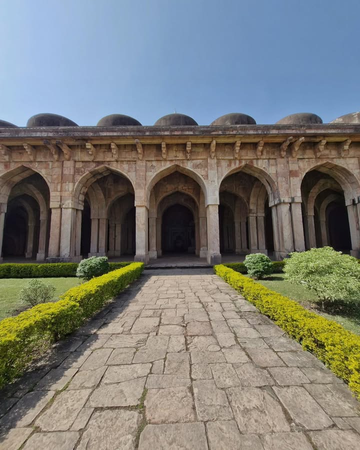 Its three towering domes, accompanied by fifty-four smaller domes, its sweeping courtyard, and its serene colonnades create a sense of both vastness and harmony. The western wall, adorned with fine 15th-century carving, still holds the artistry of a time when Mandu flourished as a cultural capital. The mosque also included chambers for royal families and honoured guests — a reminder of Mandu’s political and social prestige.