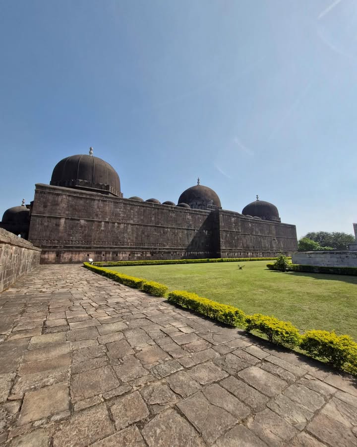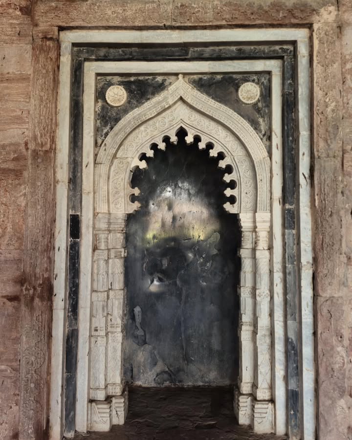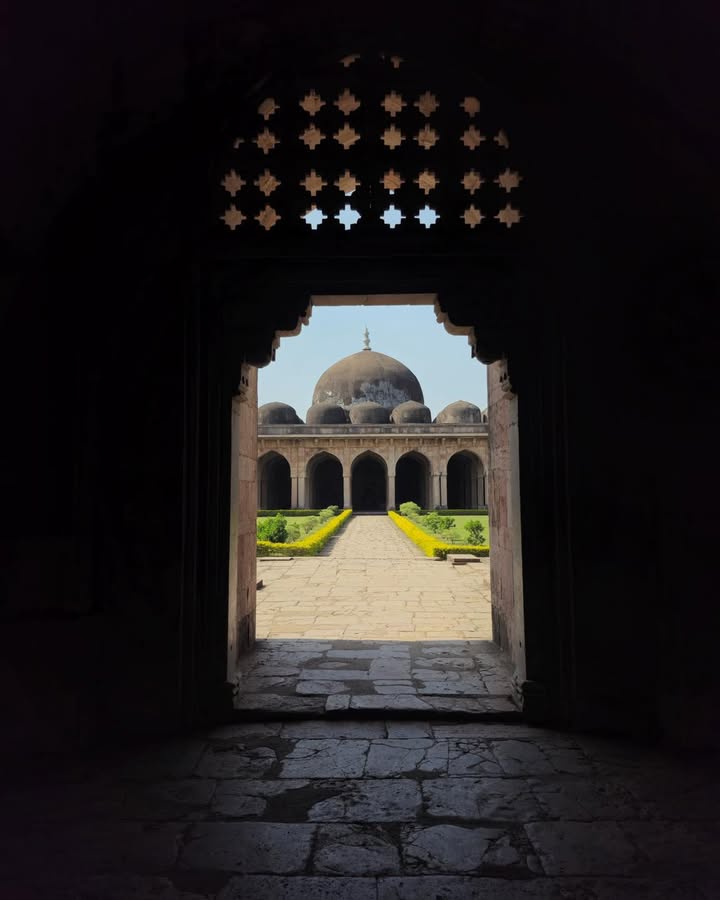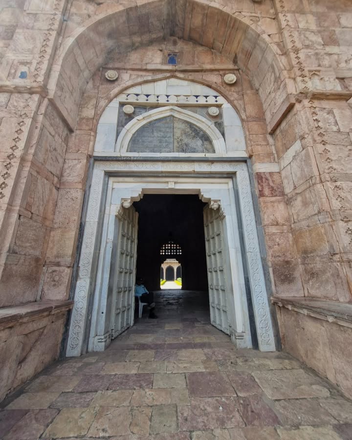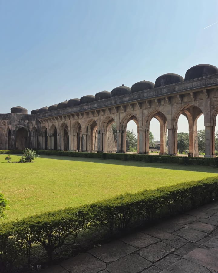 Its three towering domes, accompanied by fifty-four smaller domes, its sweeping courtyard, and its serene colonnades create a sense of both vastness and harmony. The western wall, adorned with fine 15th-century carving, still holds the artistry of a time when Mandu flourished as a cultural capital. The mosque also included chambers for royal families and honoured guests — a reminder of Mandu’s political and social prestige.
