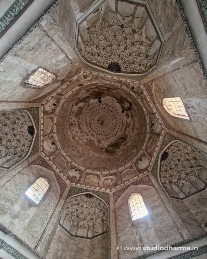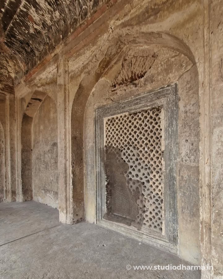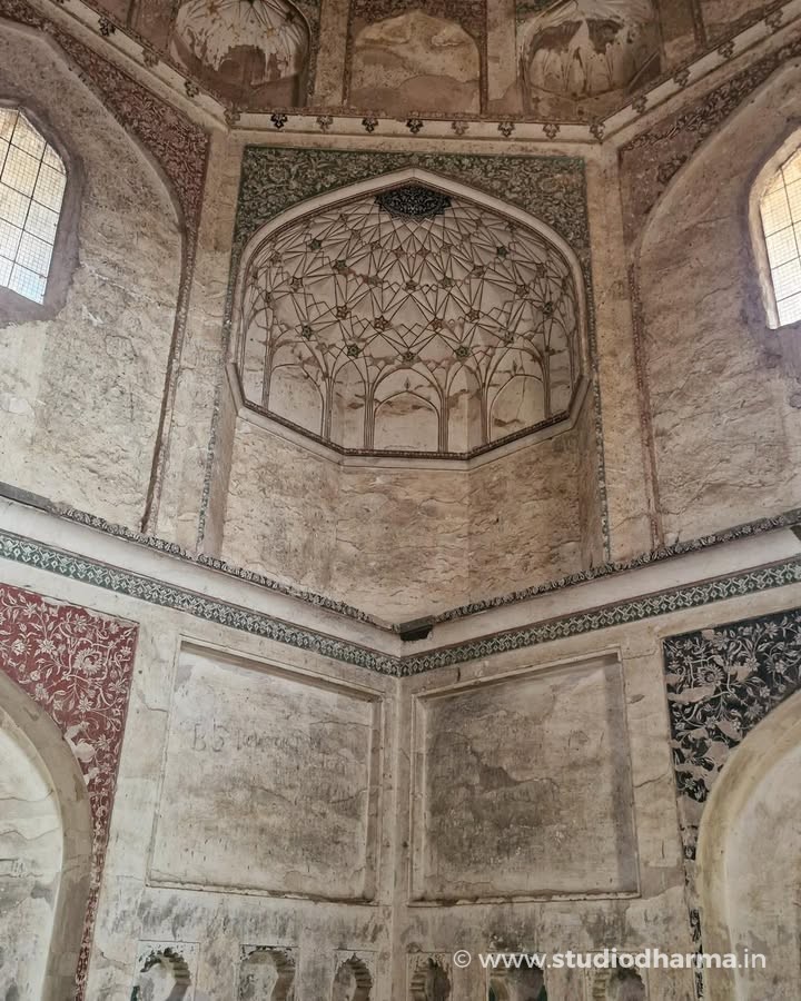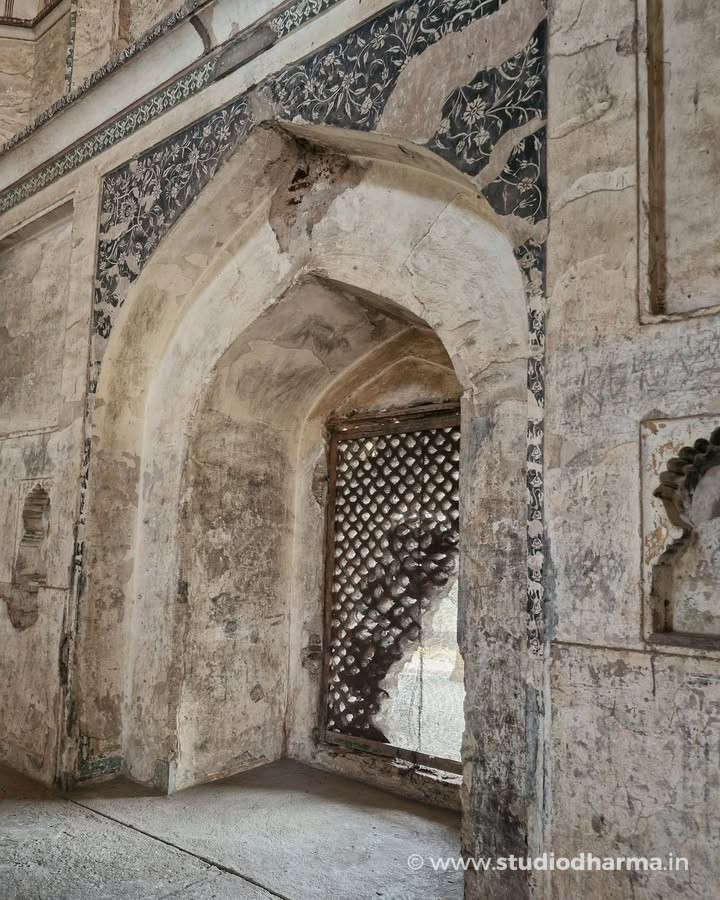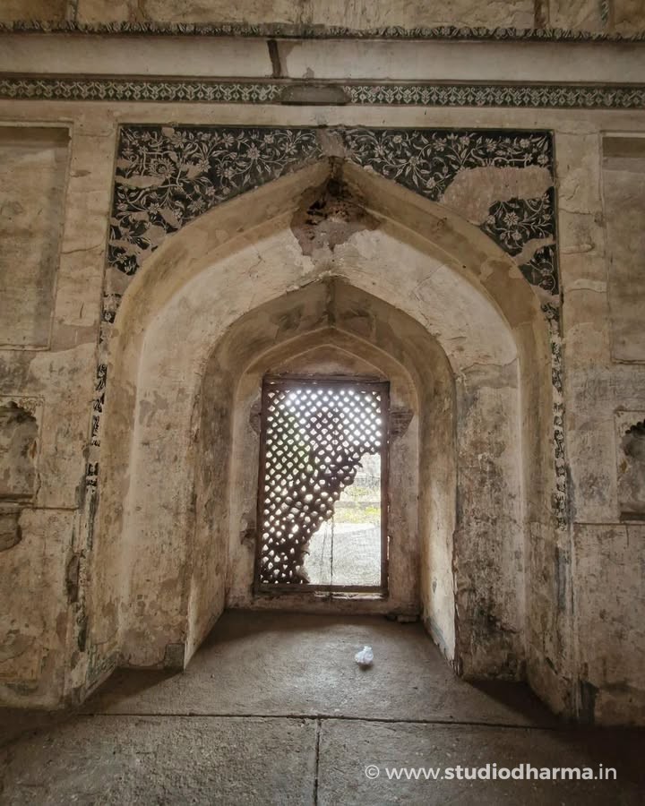 The structure itself is unique. A two-storied square plan rises with elegance, its corners marked by hexagonal minarets. The design does not strictly follow the Mughal imperial blueprint — instead, it blends influences of the Delhi Sultanate, Gujarat craftsmanship, and Deccan aesthetics.