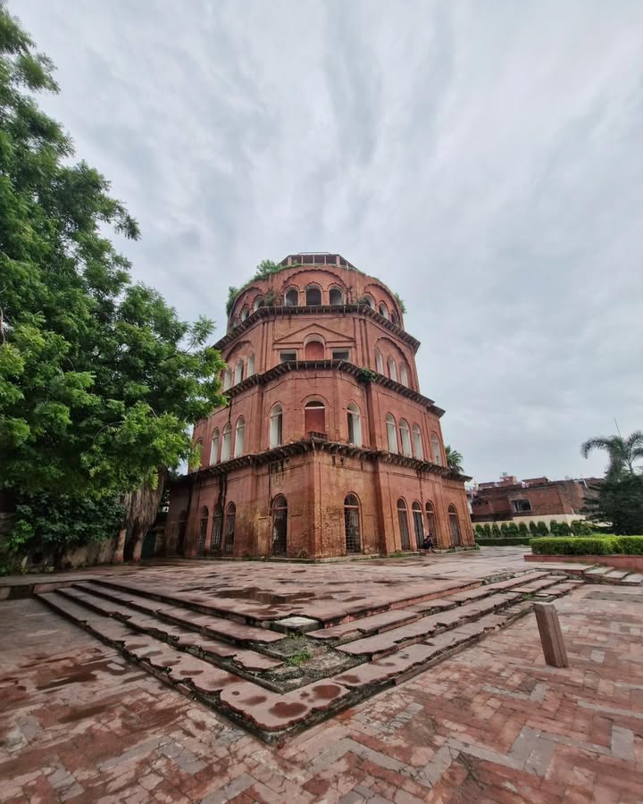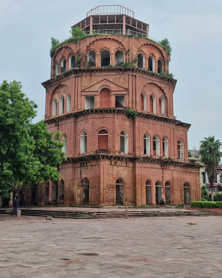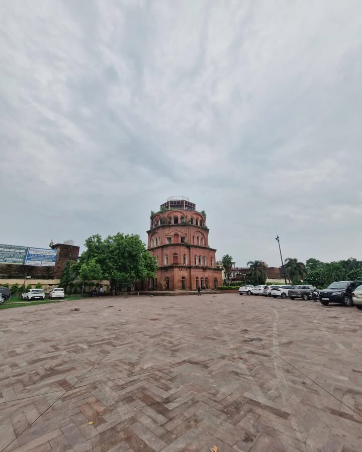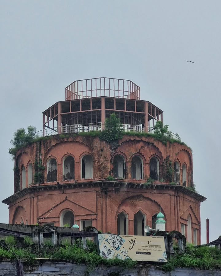 Built of red bricks, the tower reflects a rare blend of Mughal arches, French decorative sensibilities, and Greek-style proportions — a reflection of the cosmopolitan architectural vocabulary of 19th-century Lucknow. Its triple-arched windows were designed to offer a panoramic view of the old city, and some accounts suggest it may have been used for moon-sighting during festivals.